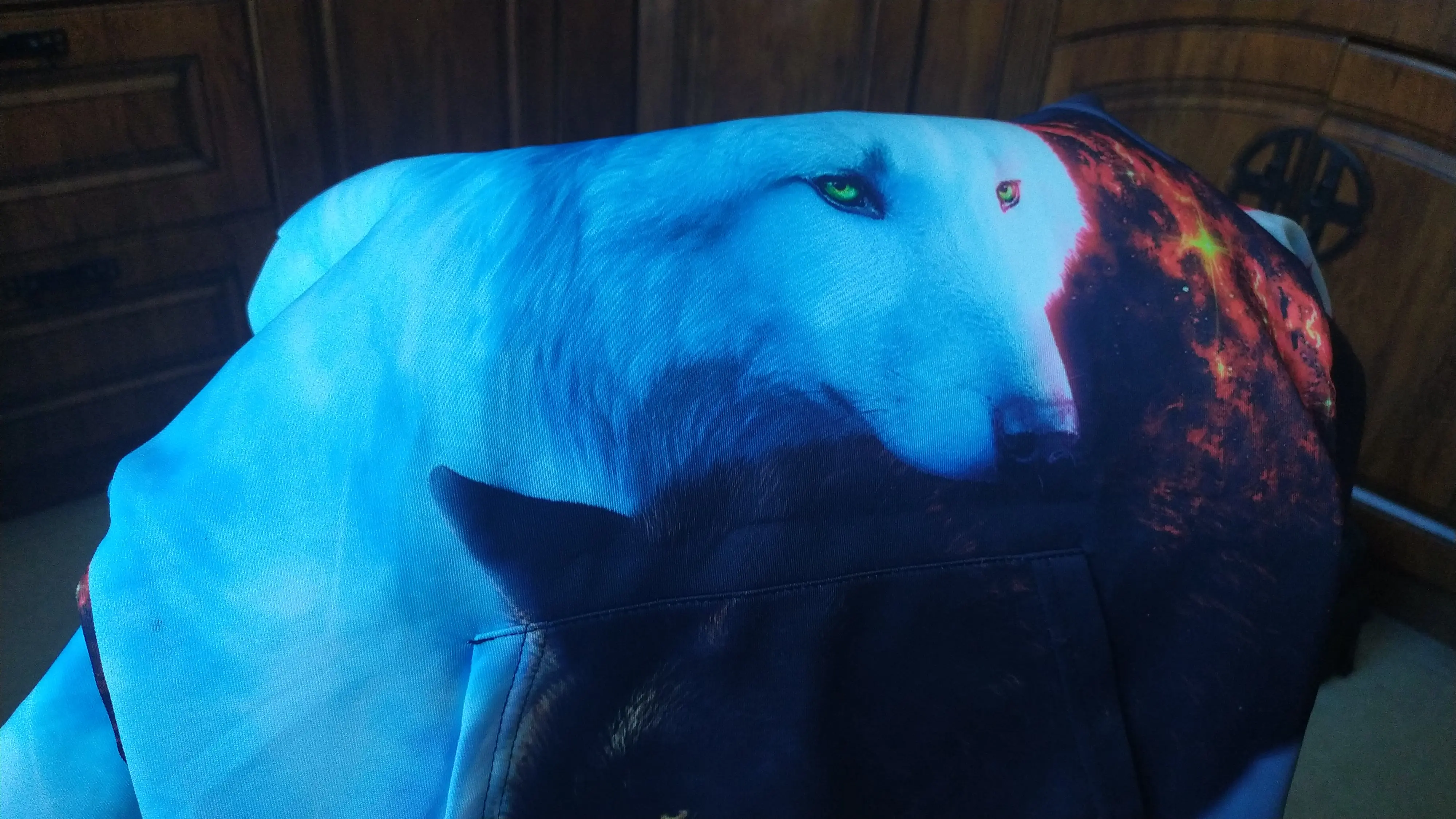 Заказывали для дочери 10 лет.Девочка не крупная.Очень любит тему волков.Заказывали во второй раз, первая куртка оказалась мала. Заказ был приурочен к новому году, и этот факт сильно разочаровал ребёнка.Размер первой куртки был "kid2",и мы решили заказать на два размера больше - XXS. "Толстовкой" это назвать нельзя, ткань тонкая, по составу синтетика,но это неизбежно, только на синтетике можно добиться ярких принтов в отличие от хлопка.Нас всё устраивало:и ткань, и крой, и рисунок.И всё бы хорошо!Когда ребёнок померил куртку,радости не было предела.Она была великовата,но на вырост пойдёт.И только родительский глаз, может заметить жуткий дефект,омрачающий праздник.На самом видном месте красовался номер,напоминающий номер заключённого!Возможно это название файла под которым рисунок хранится на компьютере.Он же есть на капюшоне с внутренней стороны.Там его не видно.Но зачем он нам на груди!?При сравнении с предыдущей курткой принт более блёклый.Будем смотреть, что произойдёт после стирки.