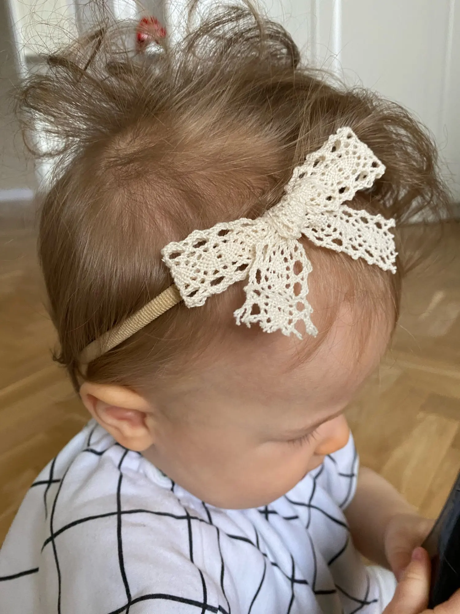 Замечательная повязка!!! Резиночка очень нежная, хорошо тянется, кружево красивое. Выполнено все качественно. Я покупала на заказ подобные повязки, и скажу честно, что эта повязка мне нравится больше. Малышка не пытается ее снять, не ощущает на голове. Просто супер! На 10 месячную крошку отлично село и ещё есть большой запас. За такую стоимость- просто подарок! Берите и не думайте!