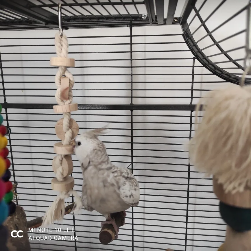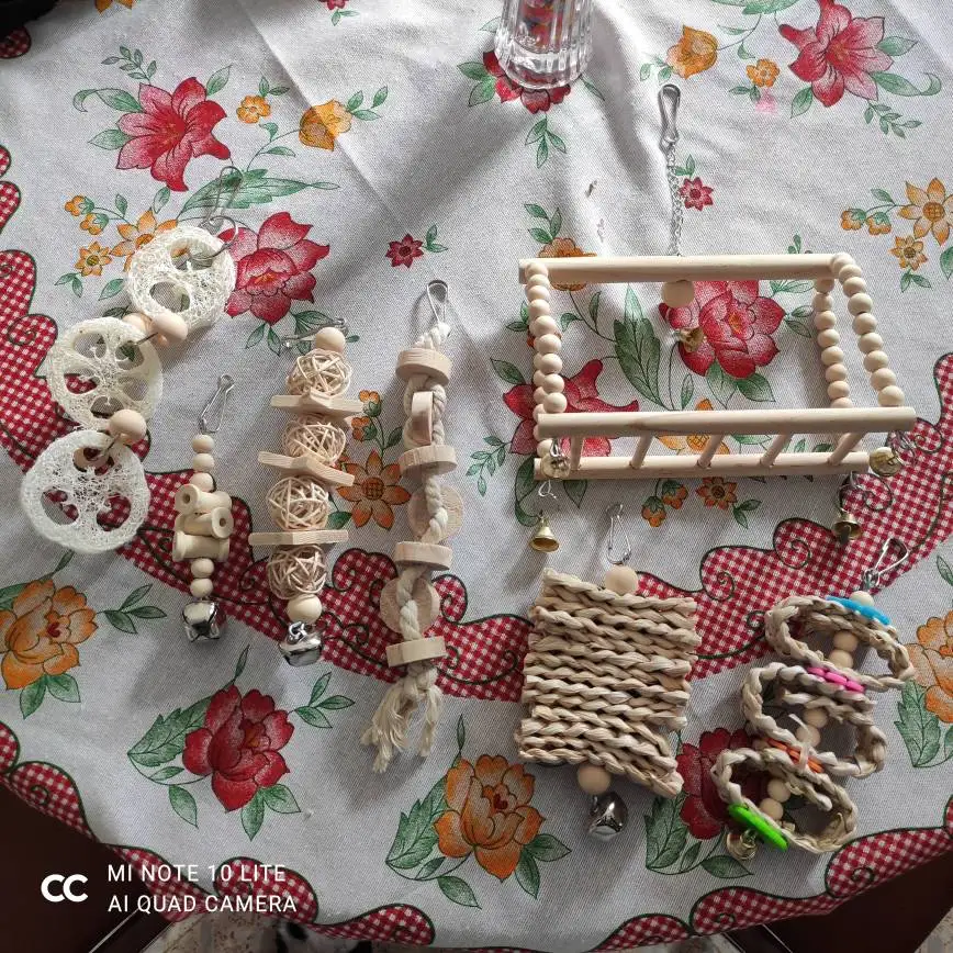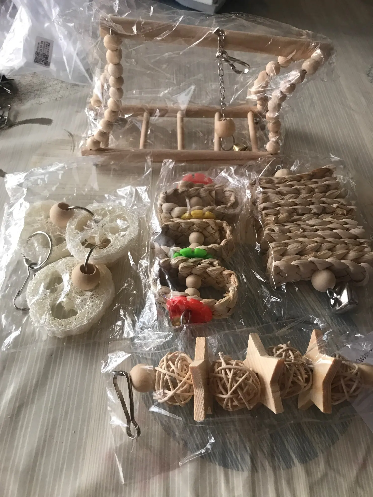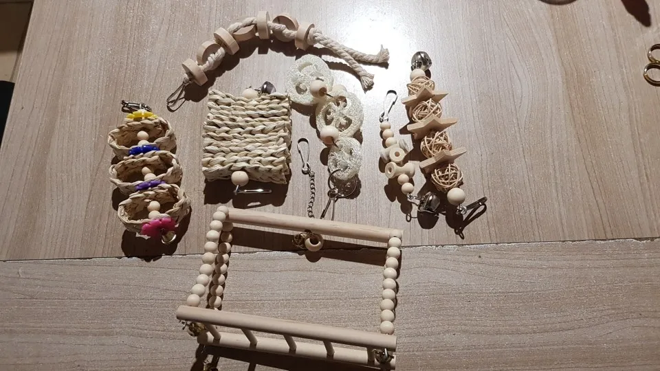 Отличные игрушки для птицы, натуральные материалы, приятные цвета. Для волнистого крупноваты жердочки, скорее для корелы подойдет
