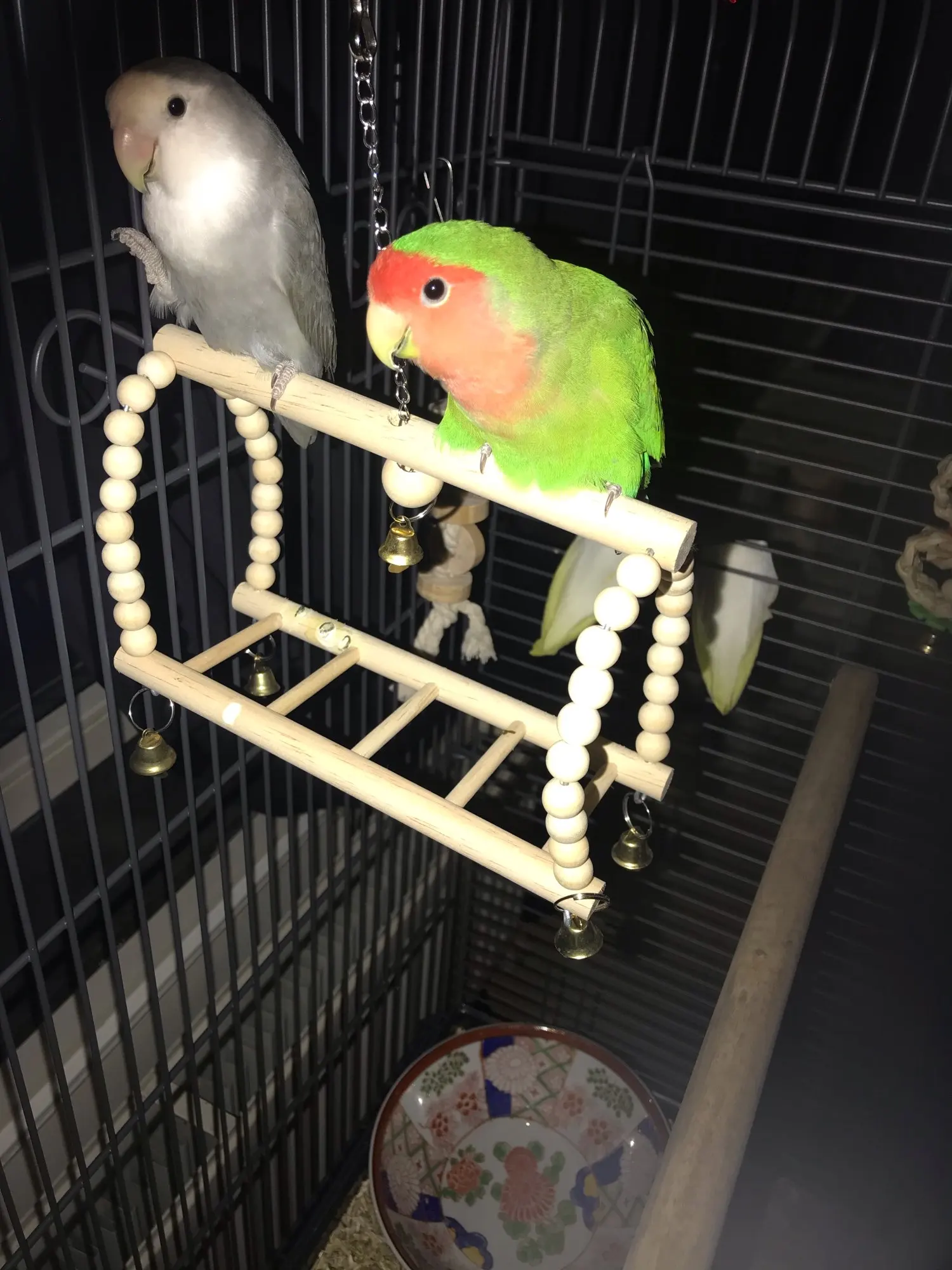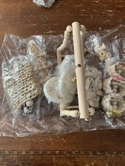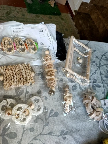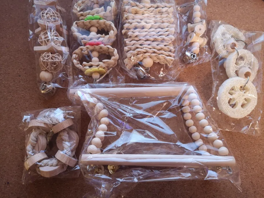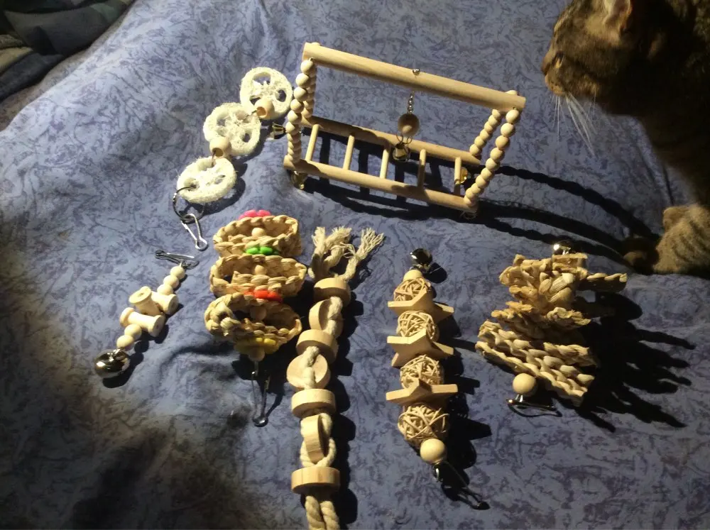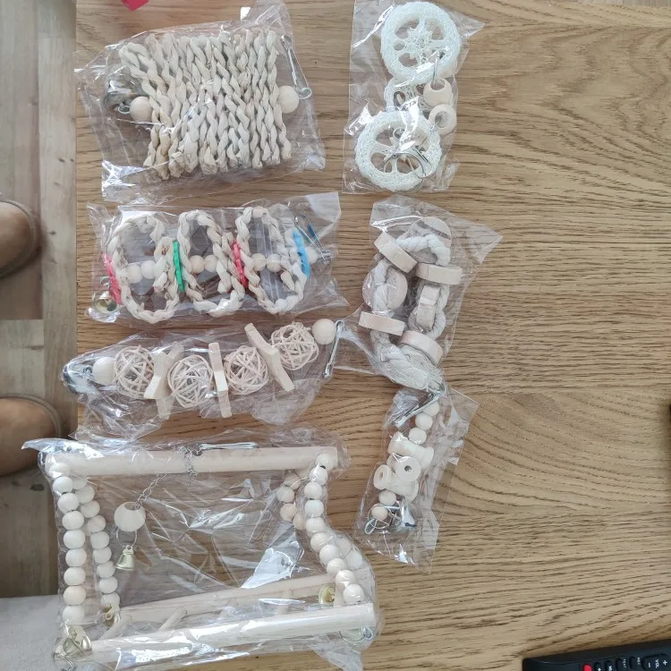 Отличные игрушки для птицы, натуральные материалы, приятные цвета. Для волнистого крупноваты жердочки, скорее для корелы подойдет