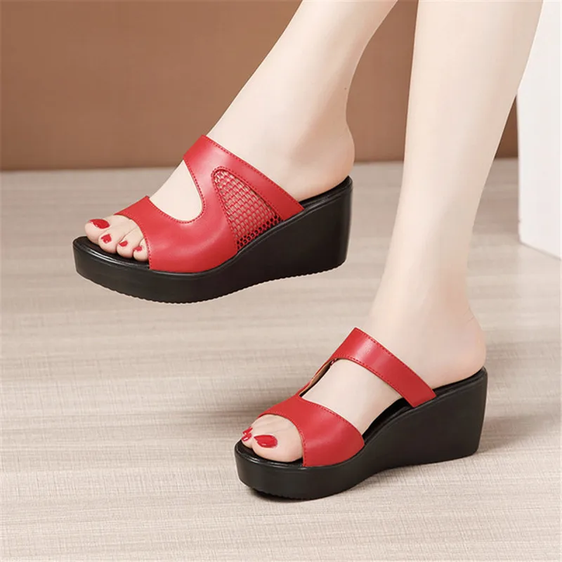 Женские шлепанцы на танкетке, Летние кожаные шлепанцы с вырезами и ...