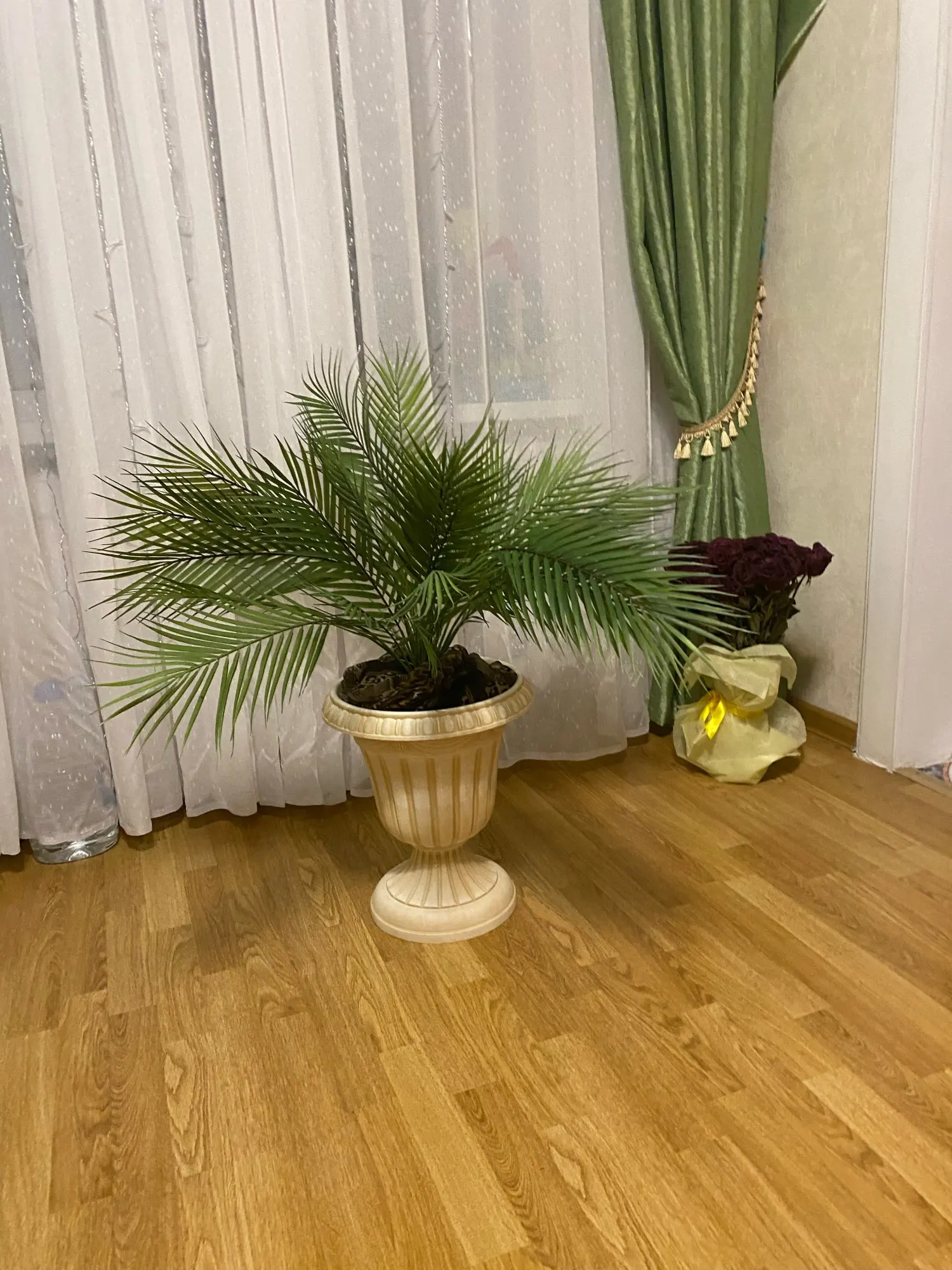 Заказывал 4 ноября и заказ отправили 6ноября. И забрал в щадринске курганской области 28 ноября. Заказал 5 веток разных размеров и количество веток пальм. Заказы были по отдельности потому что использовал купоны но пришло всё в одном вакуумном пакете. Всё очень качественно. Брал для фотосессий и себе для декора вести блог. Осталось выпрямить и собрать как показано на фото у продавца. Жаль придётся сделать удлинитель, но ничего страшного все равно выглядит супер. Для двух корзинок пальм достаточно, возможно докупить ещё смогу если будут купоны хорошие. Или другой формат пальмы например финиковая пальма.