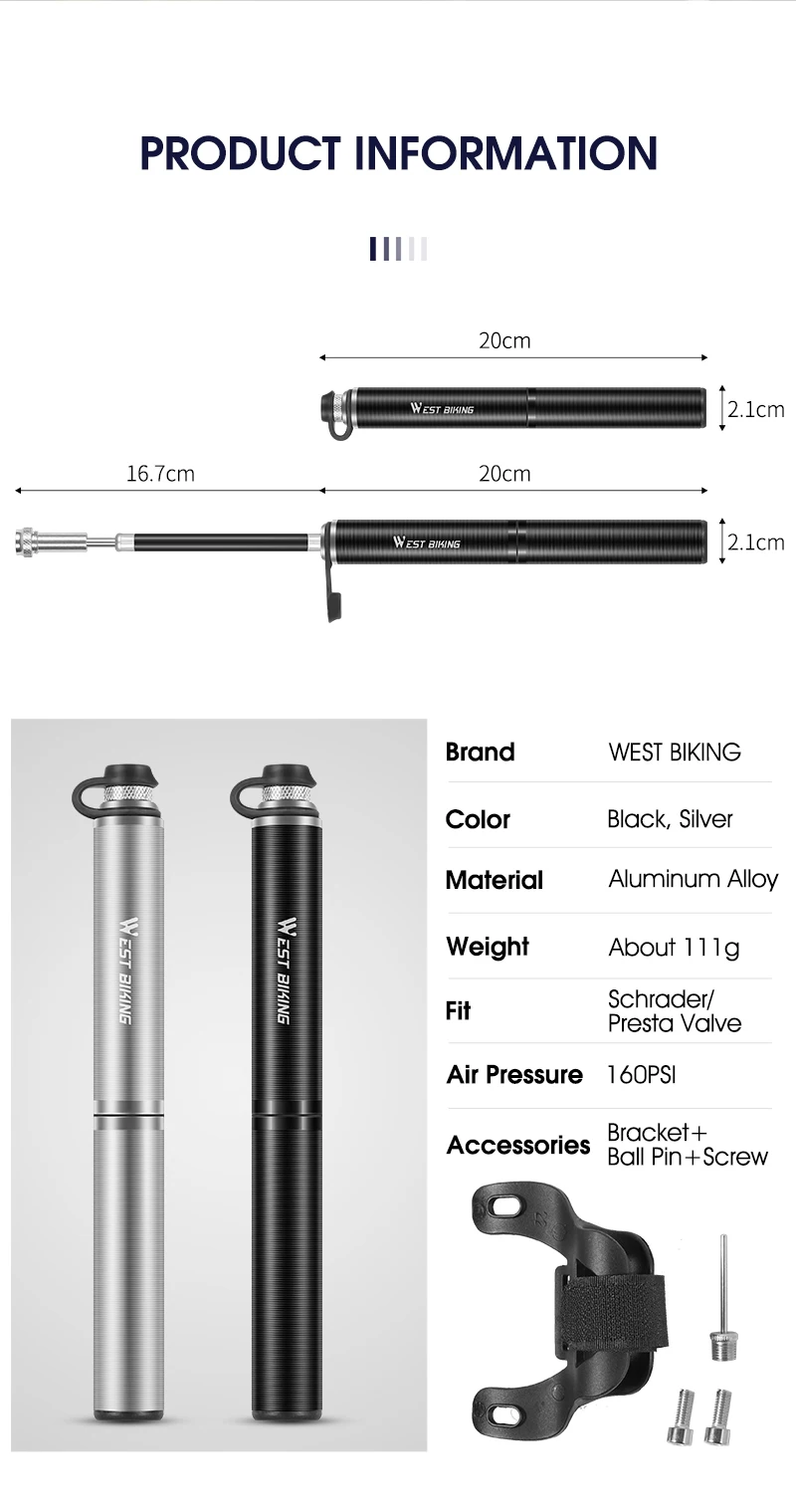 Насос велосипедный WEST BIKING, портативный, легкий из алюминиевого...