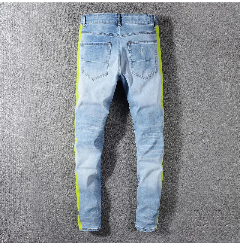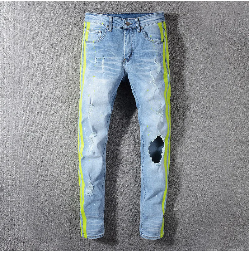 Джинсы мужские рваные в стиле пэчворк, повседневные брюки из денима с дырками, неоново-желтые полоски