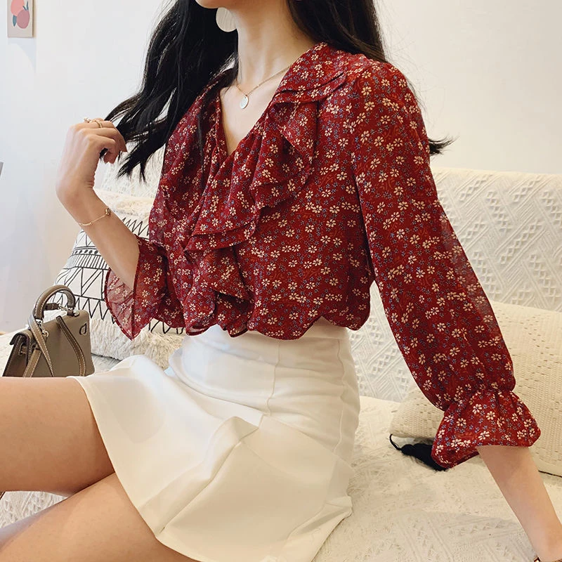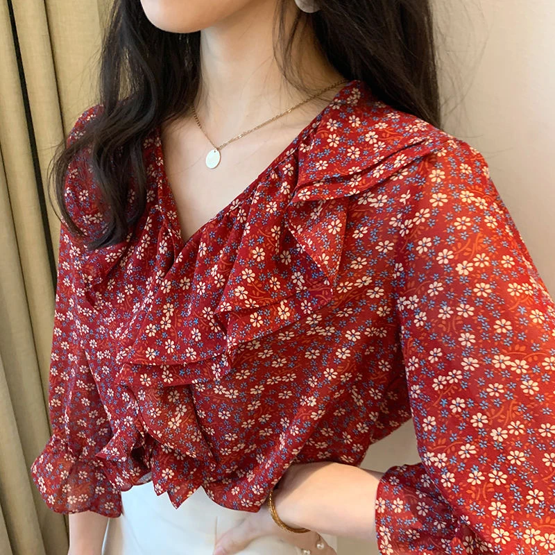 Женские весенне-летние стильные шифоновые Женские Блузки Рубашки повседневные блузы с V-образным вырезом и коротким рукавом-фонариком с цветочным принтом DD8882