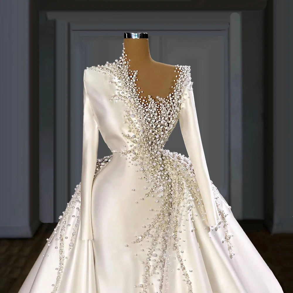 Атласные бусины, юбка со съемной юбкой, свадебные платья с длинными рукавами и бисером, свадебные платья, белое платье 2020