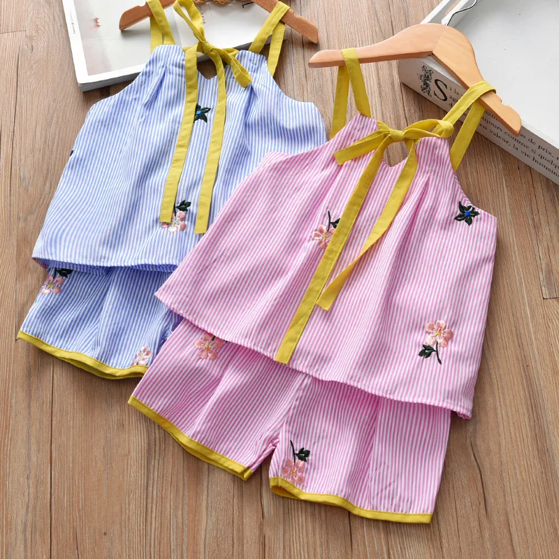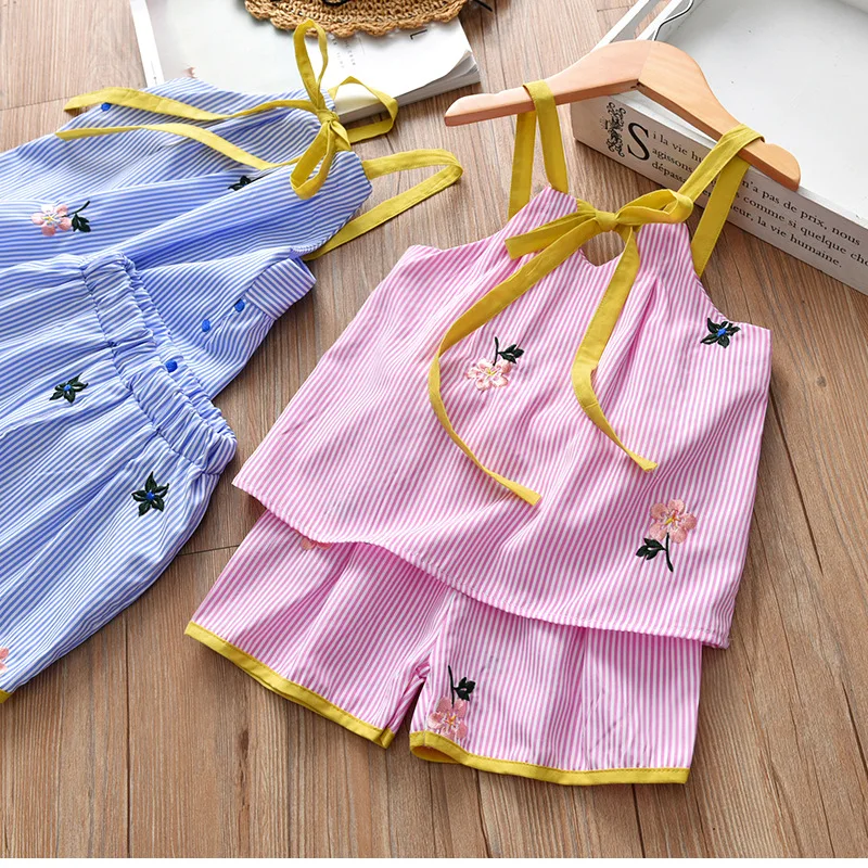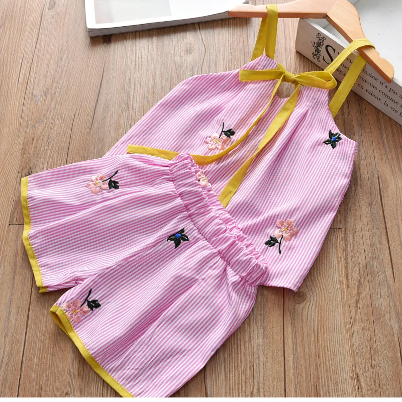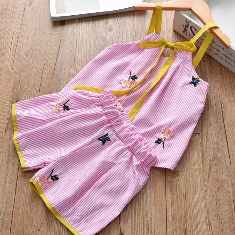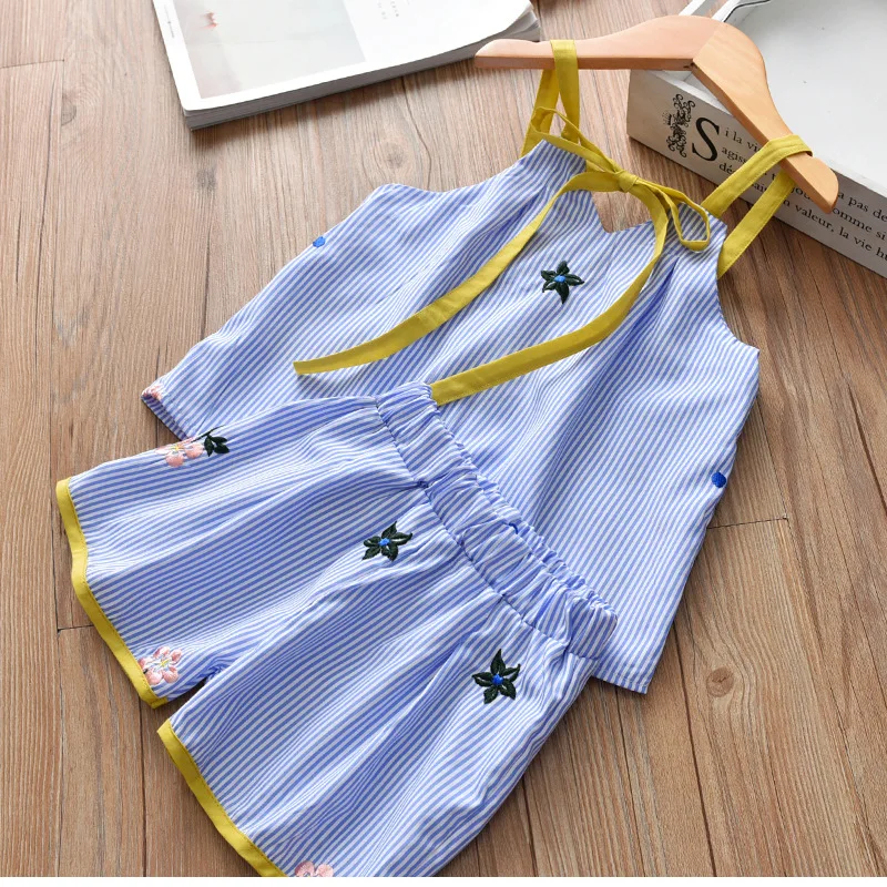 Летний костюм Одежда Для Девочек топ на бретельках и шорты комплект из 2 предметов, футболка в полоску с вышитыми цветами