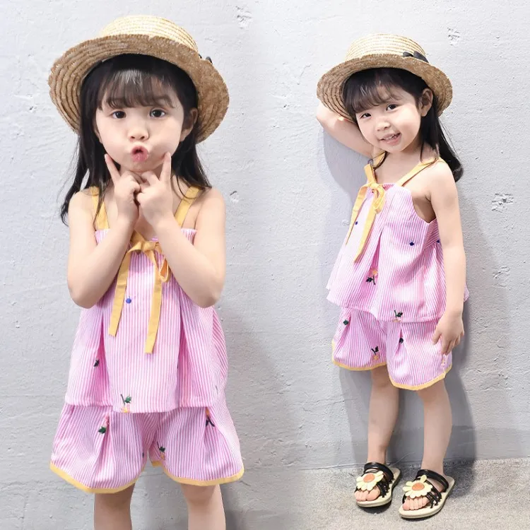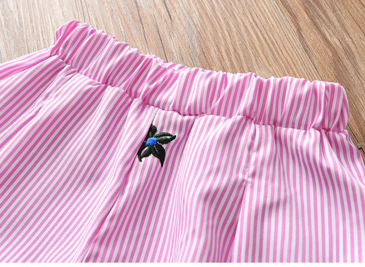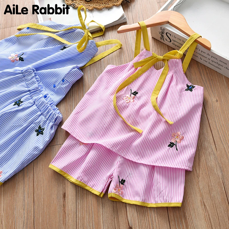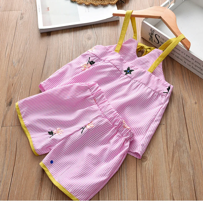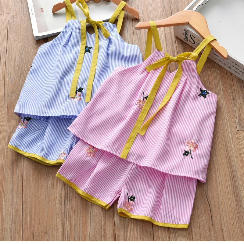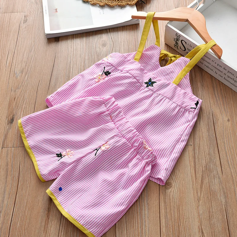 Летний костюм Одежда Для Девочек топ на бретельках и шорты комплект из 2 предметов, футболка в полоску с вышитыми цветами
