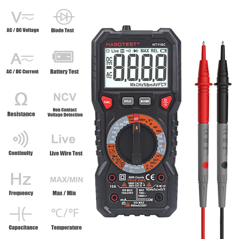 Автомобильный мультиметр HABOTEST True RMS HT118C, профессиональный цифровой тестер емкости Ом, температура Гц 1000 В переменного тока и постоянного тока