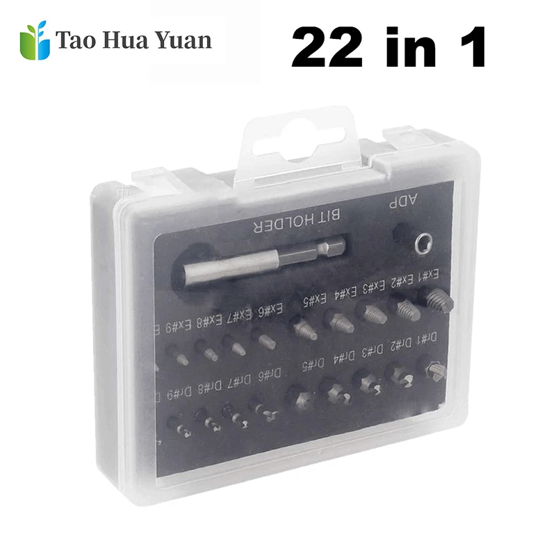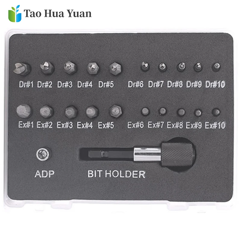 (Другие размеры могут быть непосредственно подключены к удлинительному держателю) Шаг 2: Используйте дрель (Dr) для сверления сломанного винта. Шаг 3: изменить на использование битов одного размера (Ex). Шаг 4: Используйте электрическое сверло в противоположном направлении для удаления сломанного сверла. Теплые наконечники -Необходимо сначала просверлить отверстие, когда поверхность разбивающегося винта гладкая. В противном случае Сверло будет скользить. -При сверлении необходимо иметь вертикальную и низкую скорость, при обратном использовании этот бит сверлить первое отверстие глубже будет легче вынуть. -Лучше всего использовать электрическое ручное сверло, нельзя использовать режим сверления молотка! Должна быть низкая скорость во время использования! Упаковочный лист 22 шт./компл. винтовой экстрактор