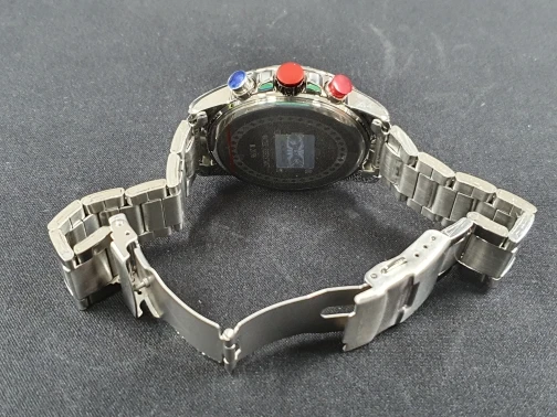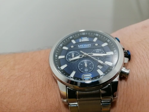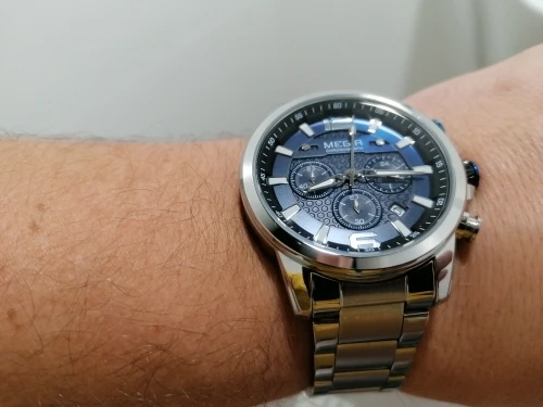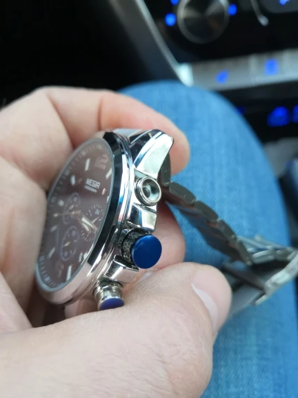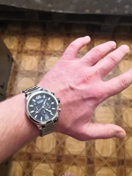 Часы крупноваты. Особенно по толщине. Учитывая, что стоит кварцевый механизм, толщина могла бы быть как минимум в 2 раза тоньше. Вероятно это задумка дизайнера или технологический ход - под любой механизм. Хронограф (два маленьких циферблата - верхний ряд) не запускаются. Первые нажатия кнопок с хрустом. Запускается и останавливается только нижняя секундная стрелочка, но не обнуляется. Застежка хлипкая, из тонкой нержавейки. При закрывании, крышка защелки болтается из стороны в сторону. После попадания на фиксирующий стерженек люфтит вверх-вниз. При закрывании скобки люфт уменьшается. После подгонки браслета, на руке сидят хорошо, но при встряхивании рукой появляется металлический звук от люфта застежки. Циферблат сделан хорошо, с гильошированием. Стрелки и цифры хорошо видны. Для подарка незнакомцу сойдет. В коробочке. Вроде как с описанием (не о чем) на русском и английском.