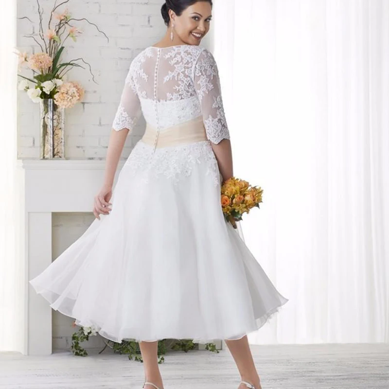 Кружевное свадебное платье с аппликацией, коротким рукавом и V-образным вырезом