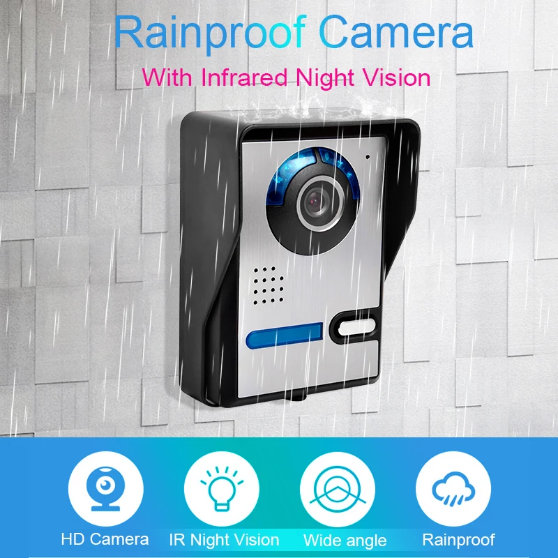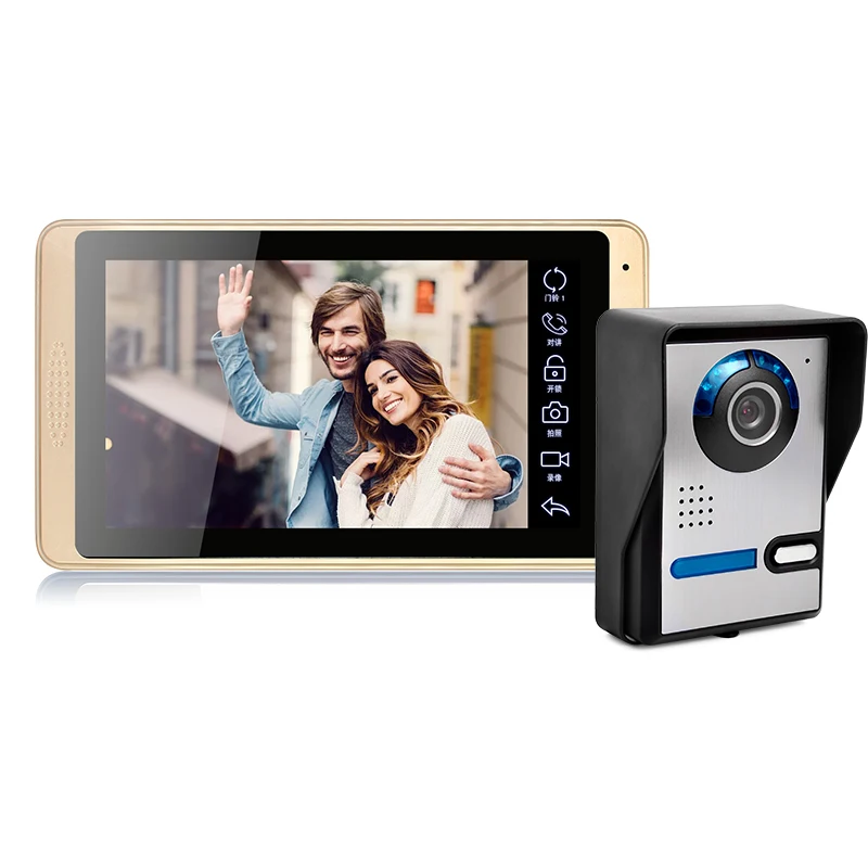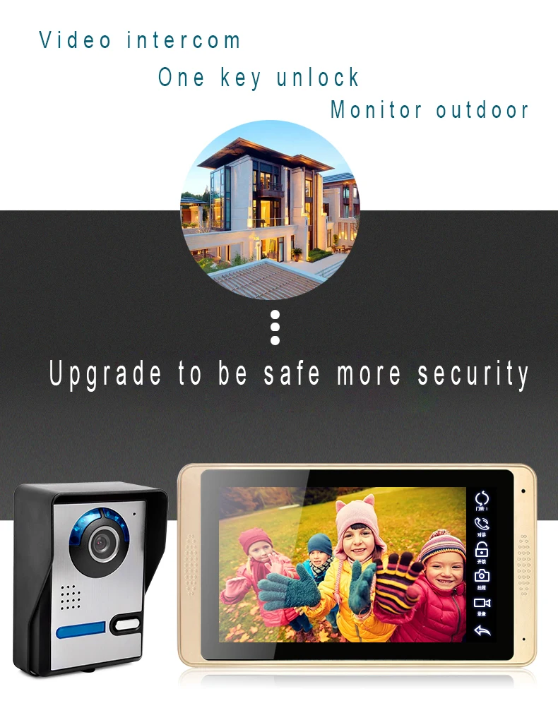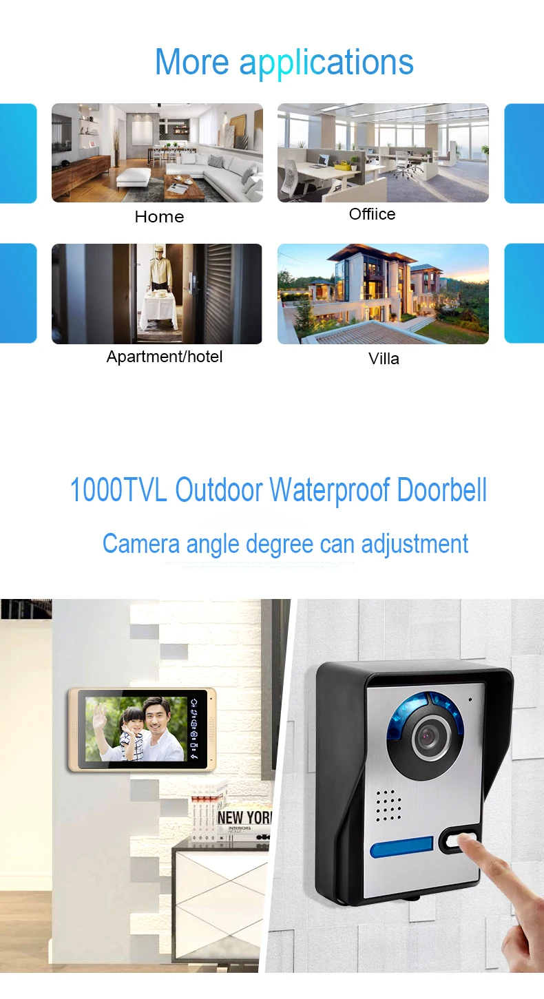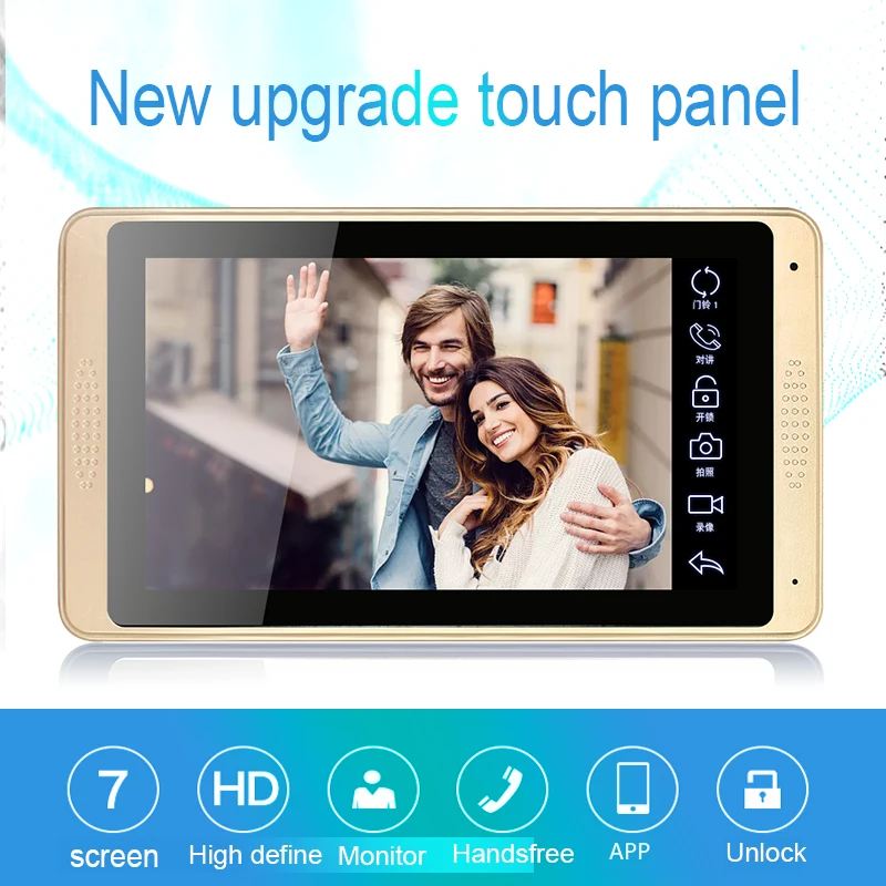 1.Indoor monitor use the multi-point capacitance touch screen,adopt to Android System,steady and easy to operate. 2.7 inch High definition digital LCD monitor,with take picture,visitor records and calendar function. 3.Indoor monitor can take picture by manually or automatically,max to support 64G TF card. 4.Indoor monitor with monitor,intercom,unlock,hands-free and Don't disturb function. 5.Volume, brightness & colorful adjustable. 6.The indoor monitor can support to connect 8 mobile phone APP user,Support IOS/Android system mobile phone , then the mobile phone can view and unlock. 7.Indoor monitor can connect to wireless wifi router. 8.Mobile APP with monitor,intercom, take picture,video record by manually and unlock functions. 9.Anti-oxidation and wear-resistant outdoor unit, with a rain-cover, wall installation more convenient. 10.Outdoor unit use 1000TVL analog high-definition camera. Features: Monitor: Display:7" TFT LCD(16:9) Resolution: 1024(H)X600(V) Unlock: Support mobile phone and tablet to unlock Additional memory: Support additional TF card (64GB max.) Touch : Yes Wifi: Yes Power supply: DC15V2A Installation: Surface mount Camera: Camera sensor: 1/3 inch CMOS View angle: 92° Definition: 1000TVL LEDs for night:IR LEDs (180°) Anti-oxidation aluminium alloy panel Power consumption: 2W Max waterproof level:IP55 Installation: Surface /flush mount Accessory: 1*Indoor Monitor 1*Outdoor Unit 1*15V/2A Power Supply 1*4-core terminal wire (5m) 1*unlock terminal wire 1*Manual 1*Mounting plate 1*Screws