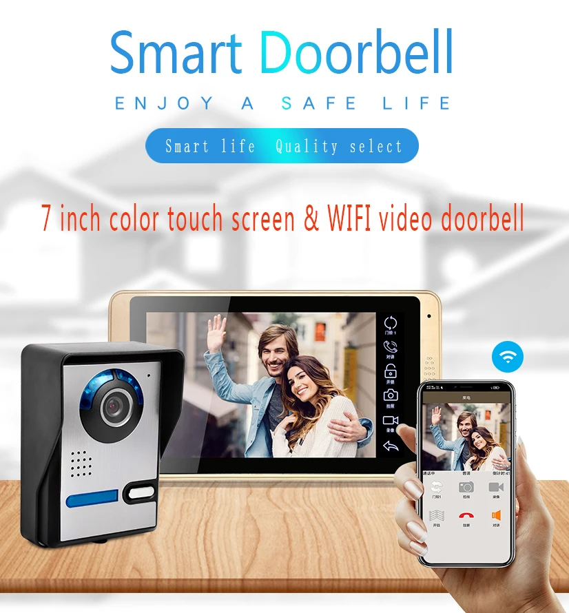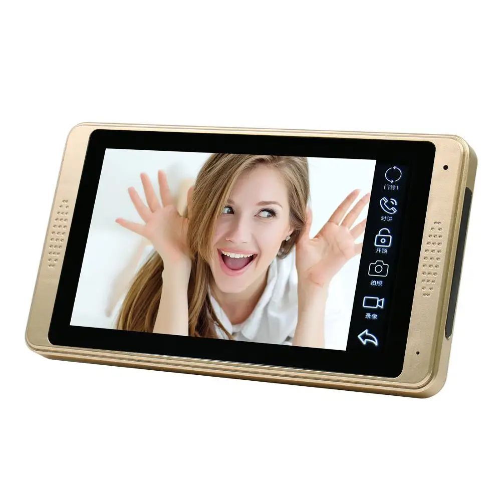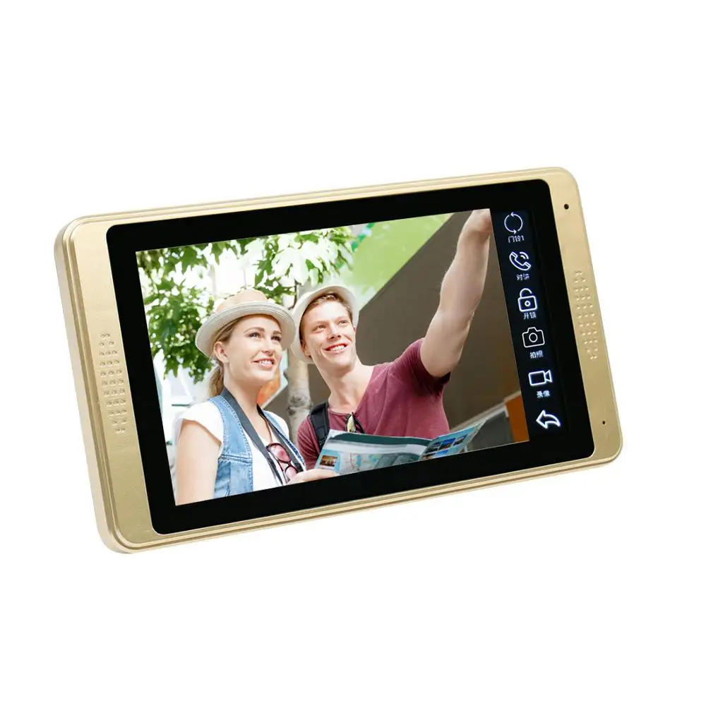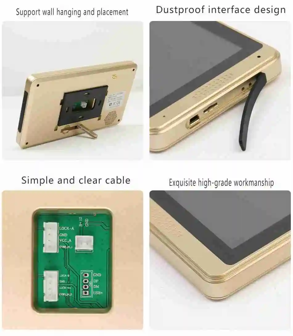 1.Indoor monitor use the multi-point capacitance touch screen,adopt to Android System,steady and easy to operate. 2.7 inch High definition digital LCD monitor,with take picture,visitor records and calendar function. 3.Indoor monitor can take picture by manually or automatically,max to support 64G TF card. 4.Indoor monitor with monitor,intercom,unlock,hands-free and Don't disturb function. 5.Volume, brightness & colorful adjustable. 6.The indoor monitor can support to connect 8 mobile phone APP user,Support IOS/Android system mobile phone , then the mobile phone can view and unlock. 7.Indoor monitor can connect to wireless wifi router. 8.Mobile APP with monitor,intercom, take picture,video record by manually and unlock functions. 9.Anti-oxidation and wear-resistant outdoor unit, with a rain-cover, wall installation more convenient. 10.Outdoor unit use 1000TVL analog high-definition camera. Features: Monitor: Display:7" TFT LCD(16:9) Resolution: 1024(H)X600(V) Unlock: Support mobile phone and tablet to unlock Additional memory: Support additional TF card (64GB max.) Touch : Yes Wifi: Yes Power supply: DC15V2A Installation: Surface mount Camera: Camera sensor: 1/3 inch CMOS View angle: 92° Definition: 1000TVL LEDs for night:IR LEDs (180°) Anti-oxidation aluminium alloy panel Power consumption: 2W Max waterproof level:IP55 Installation: Surface /flush mount Accessory: 1*Indoor Monitor 1*Outdoor Unit 1*15V/2A Power Supply 1*4-core terminal wire (5m) 1*unlock terminal wire 1*Manual 1*Mounting plate 1*Screws