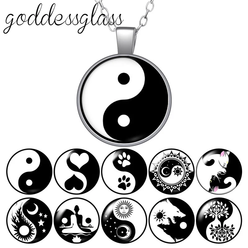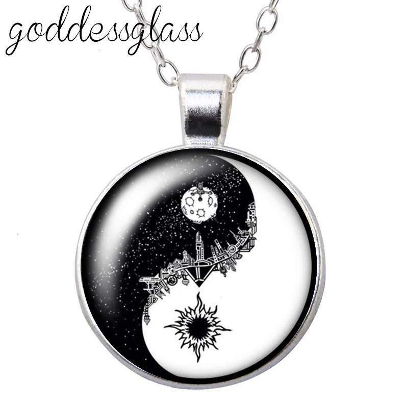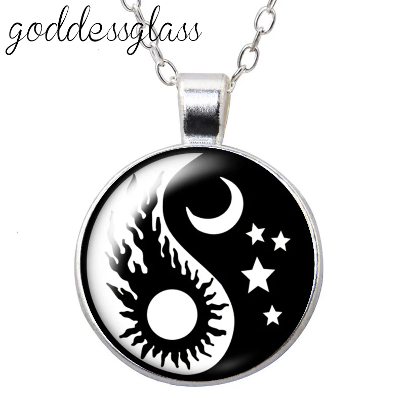 Ожерелье с подвеской в виде Луны и солнца, из черного стекла, с кабошоном, посеребреннымхрустальным покрытием