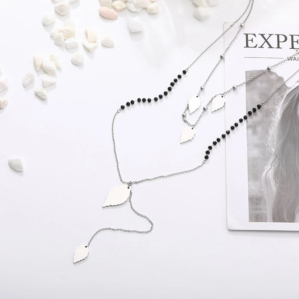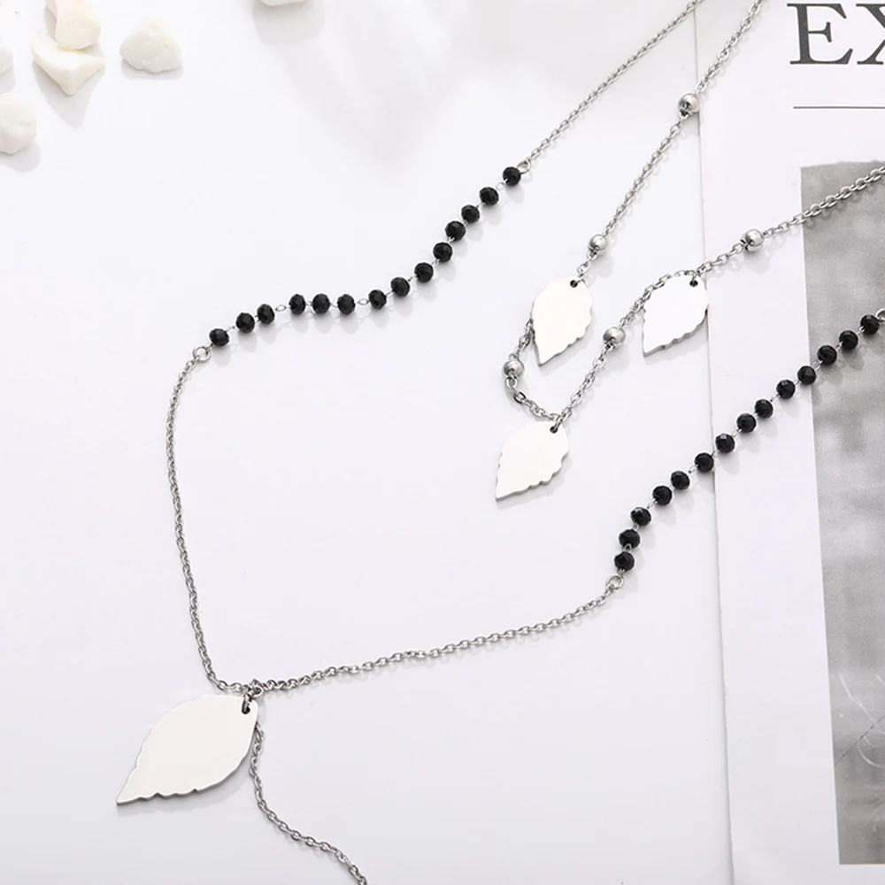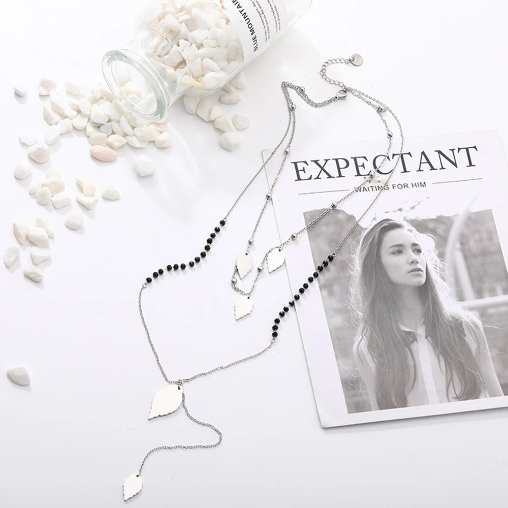 Длинная цепочка из нержавеющей стали, ожерелье для женщин, серебряный цвет, луна, звезда, лист, любовь, сердце, кулон, черные бусины, ожерелье, ювелирные изделия