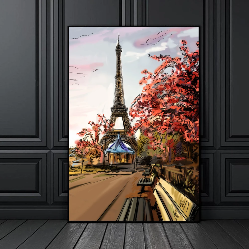 Картина маслом с изображением Парижа, Эйфелева башня, пара с зонтом...