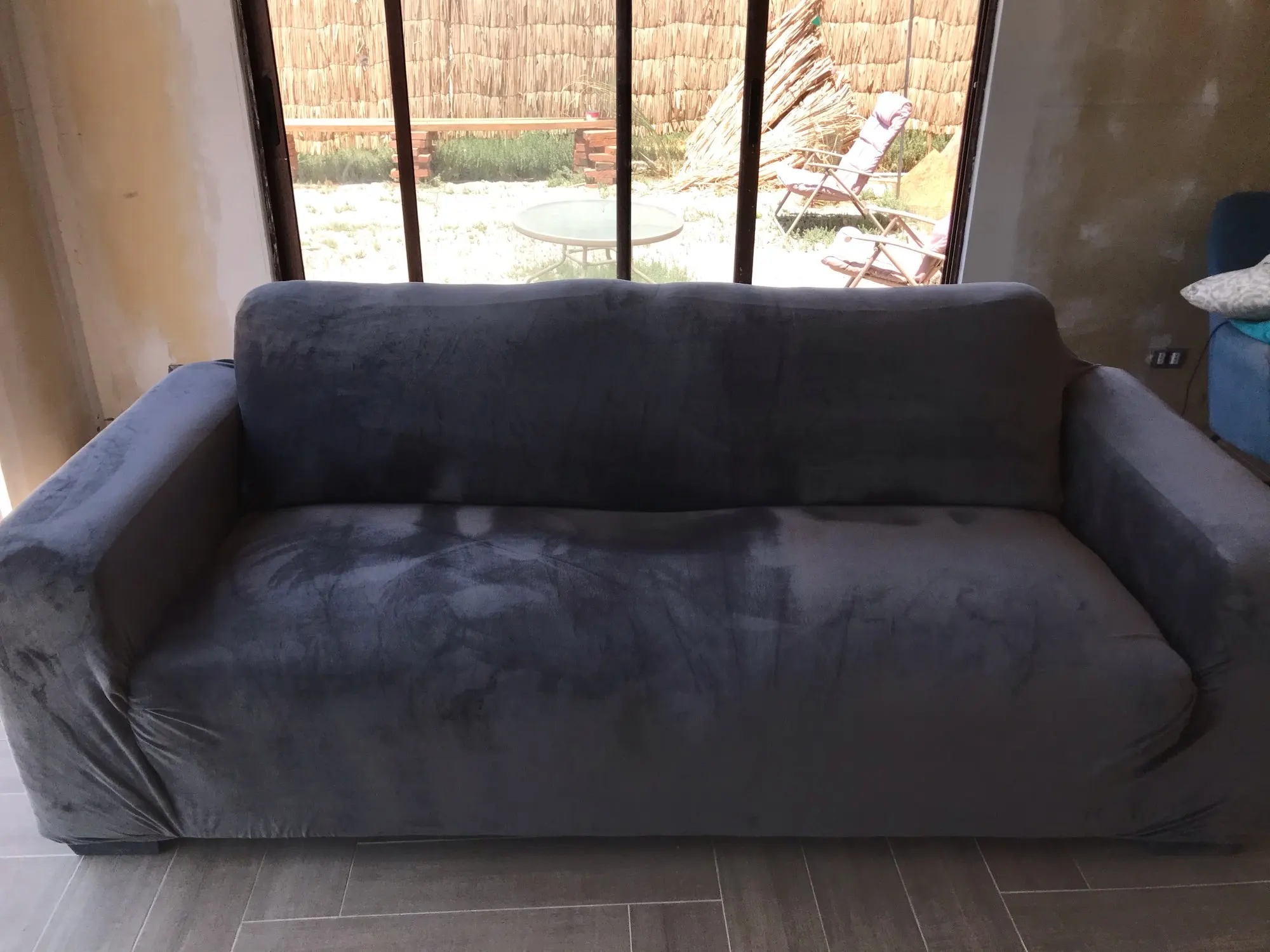 Размер чехла для дивана соответствует описанию в заказе. Материал мягкий и хорошего качества. Это не так просто надеть на диван, как я думал, но это зависит от формы мебели;) если у вас есть старая мебель, которую вы хотите сохранить, но спрятать и освежить, это будет хорошей покупкой :)