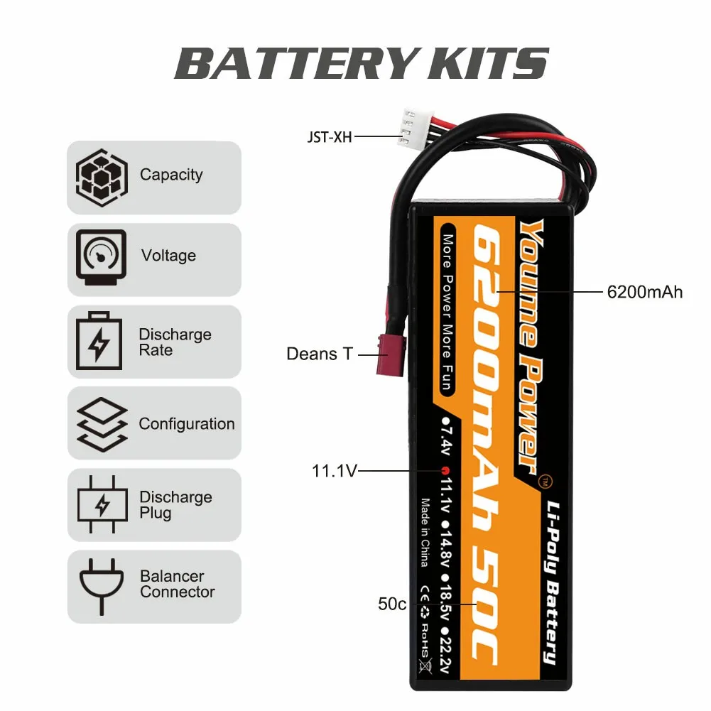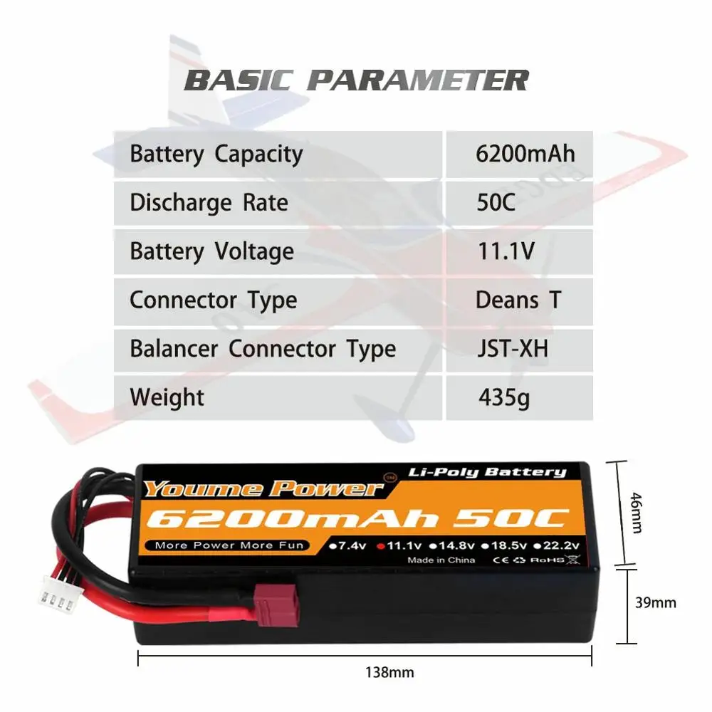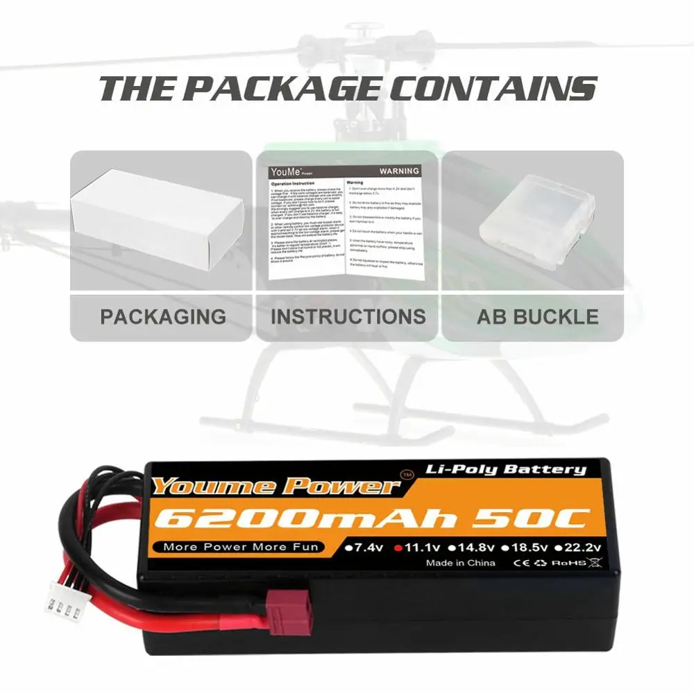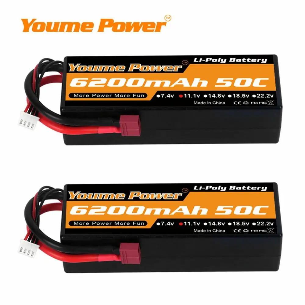 Литий-полимерный аккумулятор Youme 3S, 2 шт., 11,1 В, 6200 мАч, Твердый чехол 50C для радиоуправляемого автомобиля traxxa Trex X 110 112, радиоуправляемого грузовика, монстров, лодки Aorplane