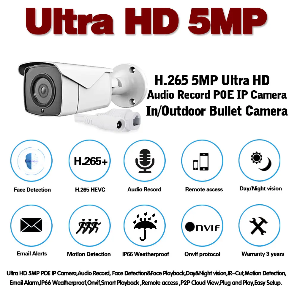 H.265 5MP SONY IMX335 Hi3516EV300 5MP звуковая аудио запись POE Bullet IP камера наружная металлическая Всепогодная IP CCTV камера видеонаблюдения ИК-светодиоды P2P ONVIF 48V POE для Poe NVR системы наборы