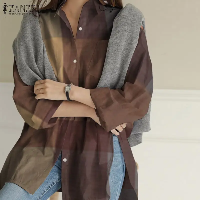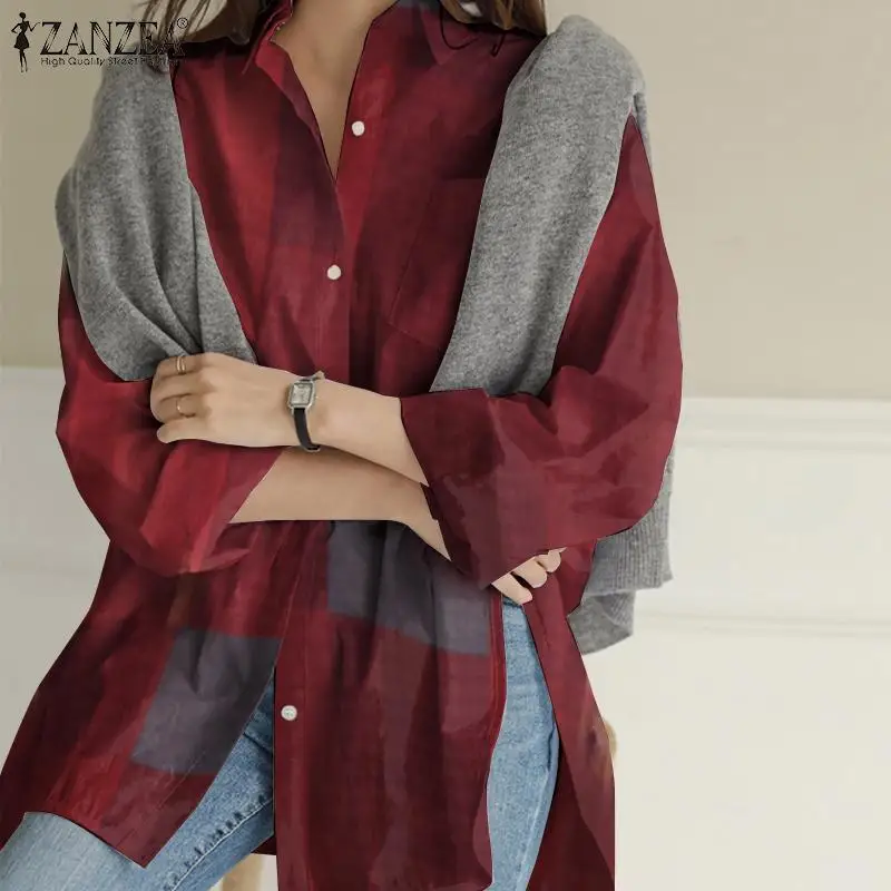 Блузка ZANZEA Женская с длинным рукавом, Повседневная Свободная рубашка, кафтан, клетчатый топ с карманами, ассиметричная сорочка, на осень