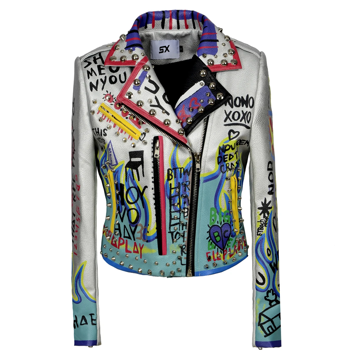 Новая женская повседневная куртка с рисунком граффити, пальто с заклепками, верхняя одежда с длинными рукавами, модная уличная одежда на осень и зиму