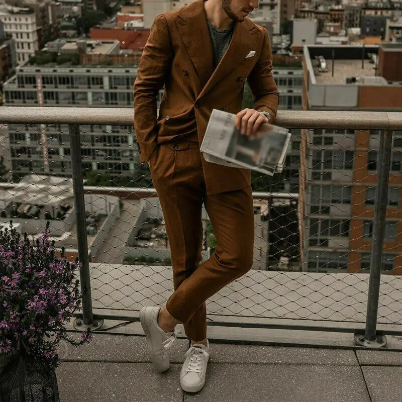Красивые коричневые костюмы из 2 предметов (пальто + брюки), мужские костюмы на заказ, хлопковый двубортный Блейзер, деловой костюм