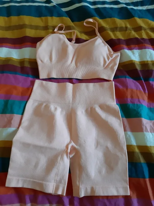 Шикарный комплект. В топе есть подкладка для груди. Шорты утягивают талию. Все шикарно! Еще обязательно куплю тут. 10/10