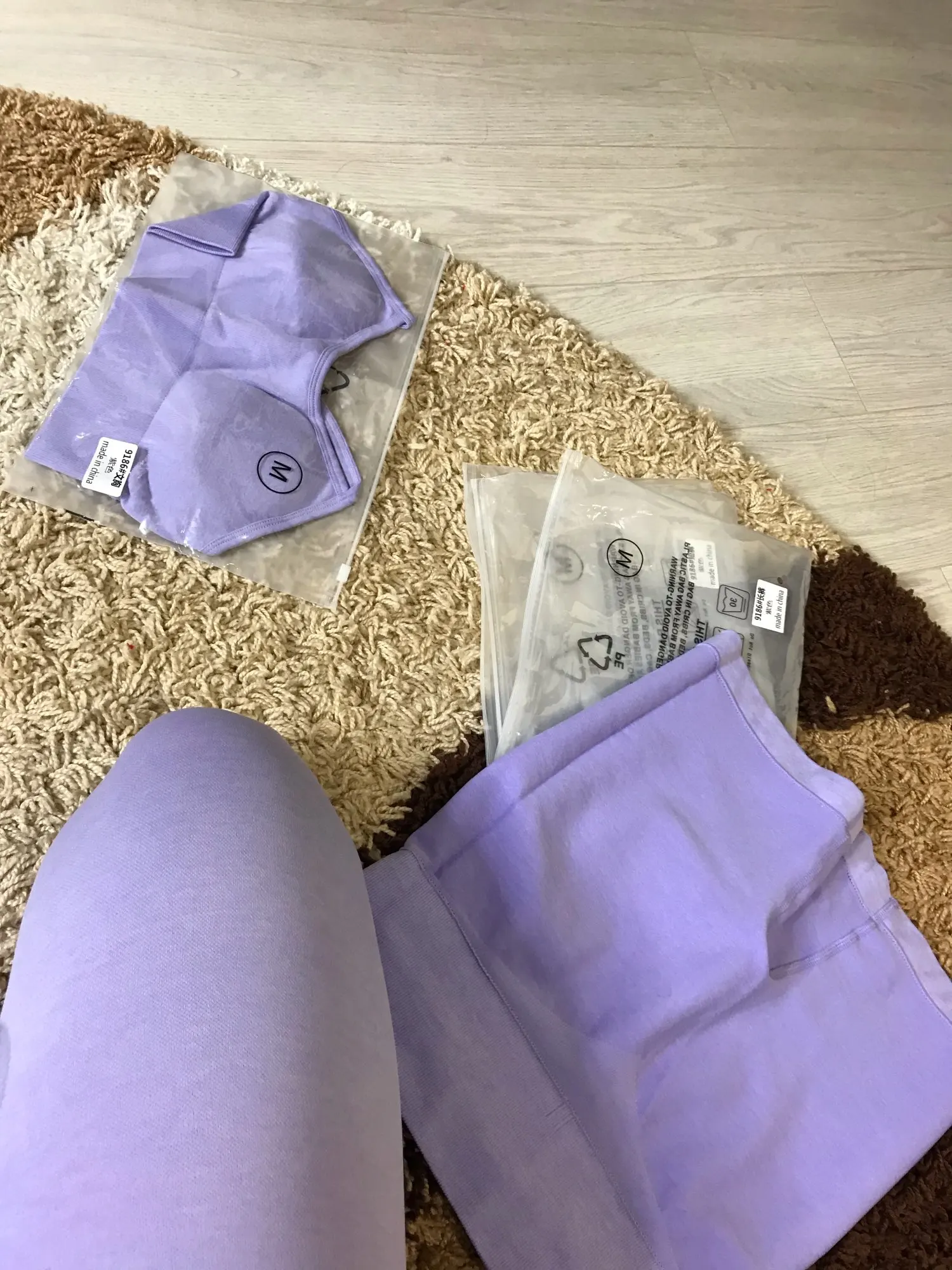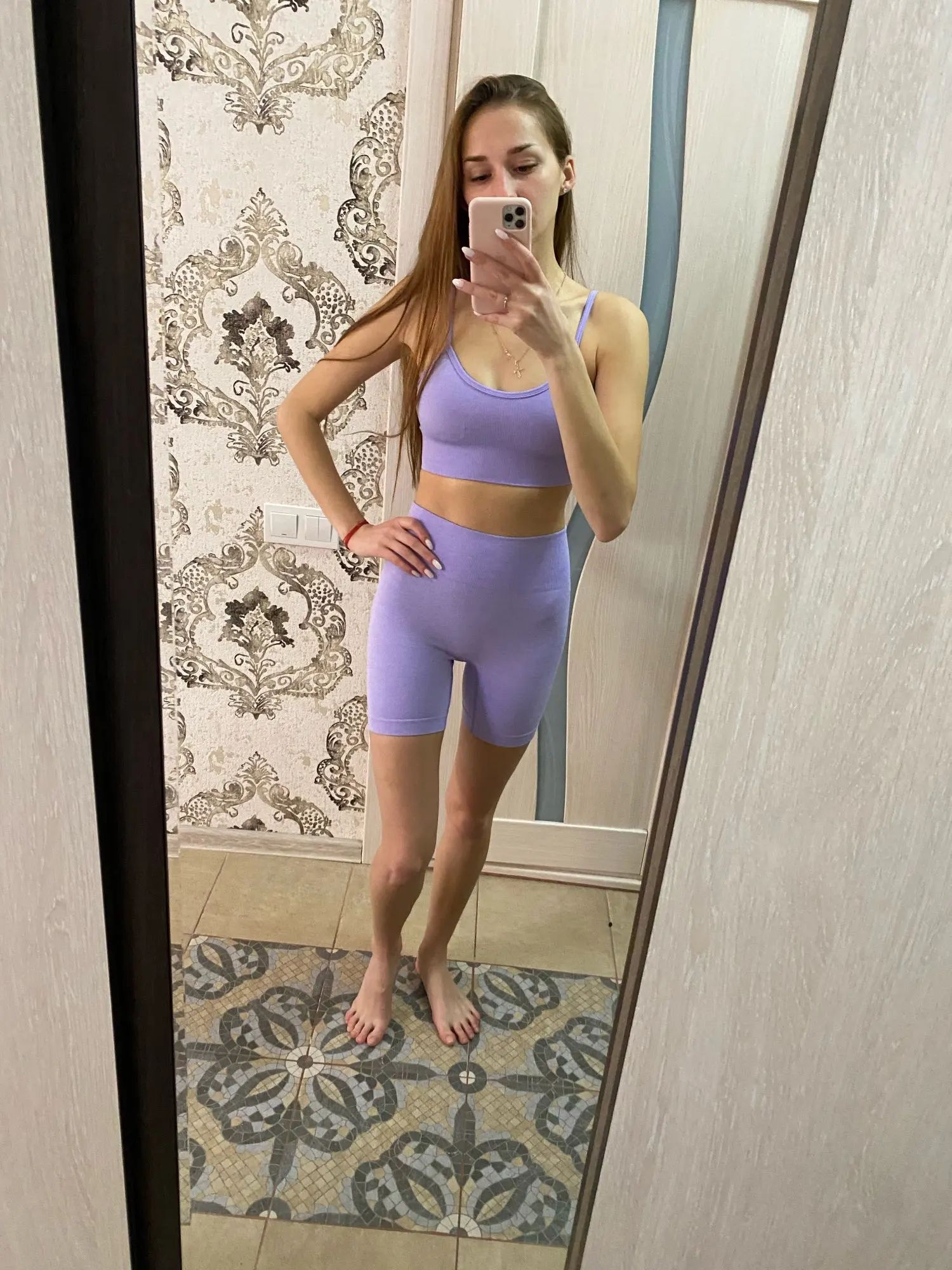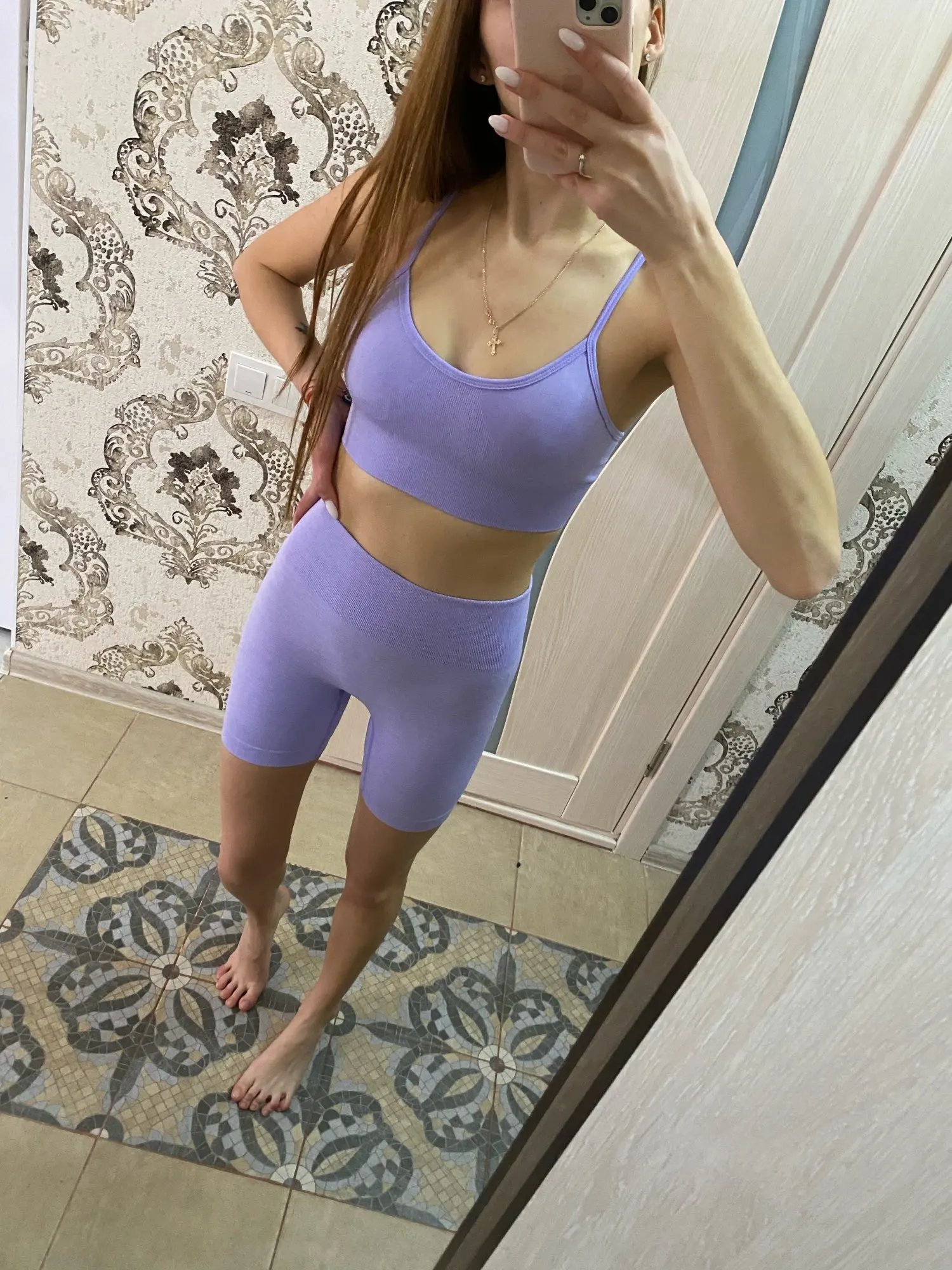 На параметры 86-65-94 заказала М, грудь сейчас третий размер, наверное. Село неплохо, но не идеально. В талии нет сильной утяжки и плотного обхвата, в некоторых положениях (фото 3) сзади велосипедки начинают оттопыриваться. Это бесит и это чисто проблема пошива, т.к резинка по ширине и плотности ровно такая же, как штанины. Если взять размер s, то вероятно в талии сядет лучше, но бедра (ляжки) будет пережимать. Топ сидит хорошо, но можно бы попробовать размер s для сравнения. Заказала из-за цвета, очень люблю лавандовые оттенки, довольна где-то на 7 из 10