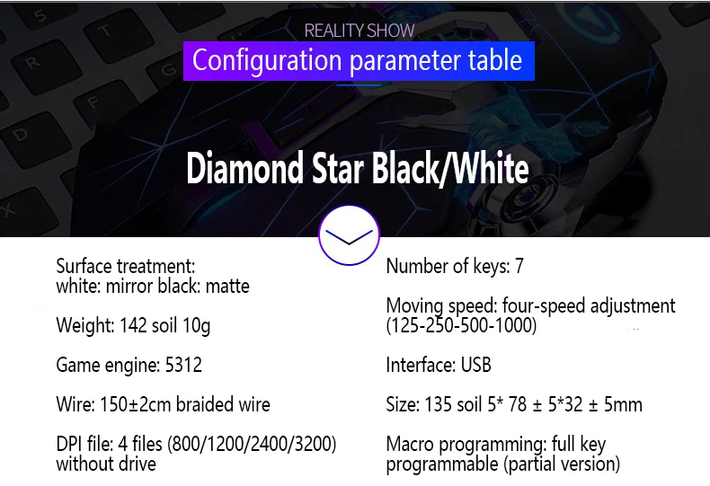 1: Модель продукта: игровая мышь HD2: 100% новая мышь3: Высококачественная брендовая Механическая игровая мышь для макросъемки HD4: эргономичный дизайн5: 7 программируемых клавиш6: Крутой светодиодный светильник с переменным эффектом7: пройденное расстояние в 4 уровня регулировки скорости Точек на дюйм, максимальная 3200 Точек на дюйм (1200/1600/2400 / 3200 Точек на дюйм)8: USB plug and play9: срок службы переключателя: 20 миллионов циклов10: длина линии: 170 см11: Вес изделия: 162 г12: размер изделия: 122*75*40 мм (длина * ширина * высота)13: Вес упаковки: 234 грамма15: Поддержка Windows 2000 / XP / win7 / win8 / win10 Vista 32 бит IOS или последней версии.