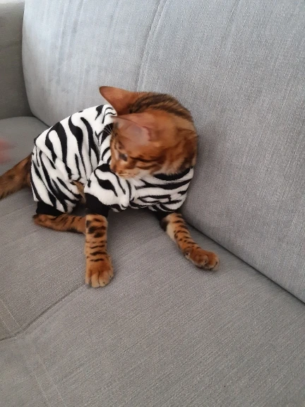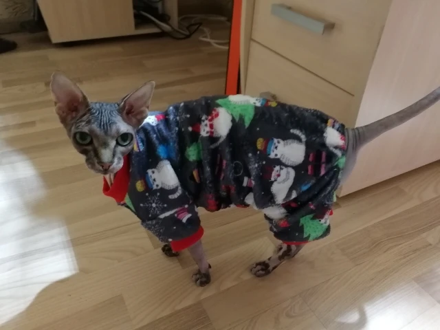 Заказываю второй раз у жтого продавца. Комбинезон хороший, флисовый, не сильно плотный, в самый раз для дома. Сшиты для собачек, поэтому первый раз, заказав розовый комбез на последнем фото размера S, прогадала немного. Хоть и выглядит на фото нормально, на деле для кошки весом 3,2 кг. коротковато по спинке, всё таки они больше тянутся, чем собаки А горловина широковата, вылазила через неё. Пришлось заказать размер М и ушить в горловине, передних рукавах, по груди и пузику, и вставила резинки к задним штанишкам. На этот раз по спинке село хорошо. Кошка двигается нормально, прыгает, ничего не жмет и не тянет. Большое спасибо продавцу!