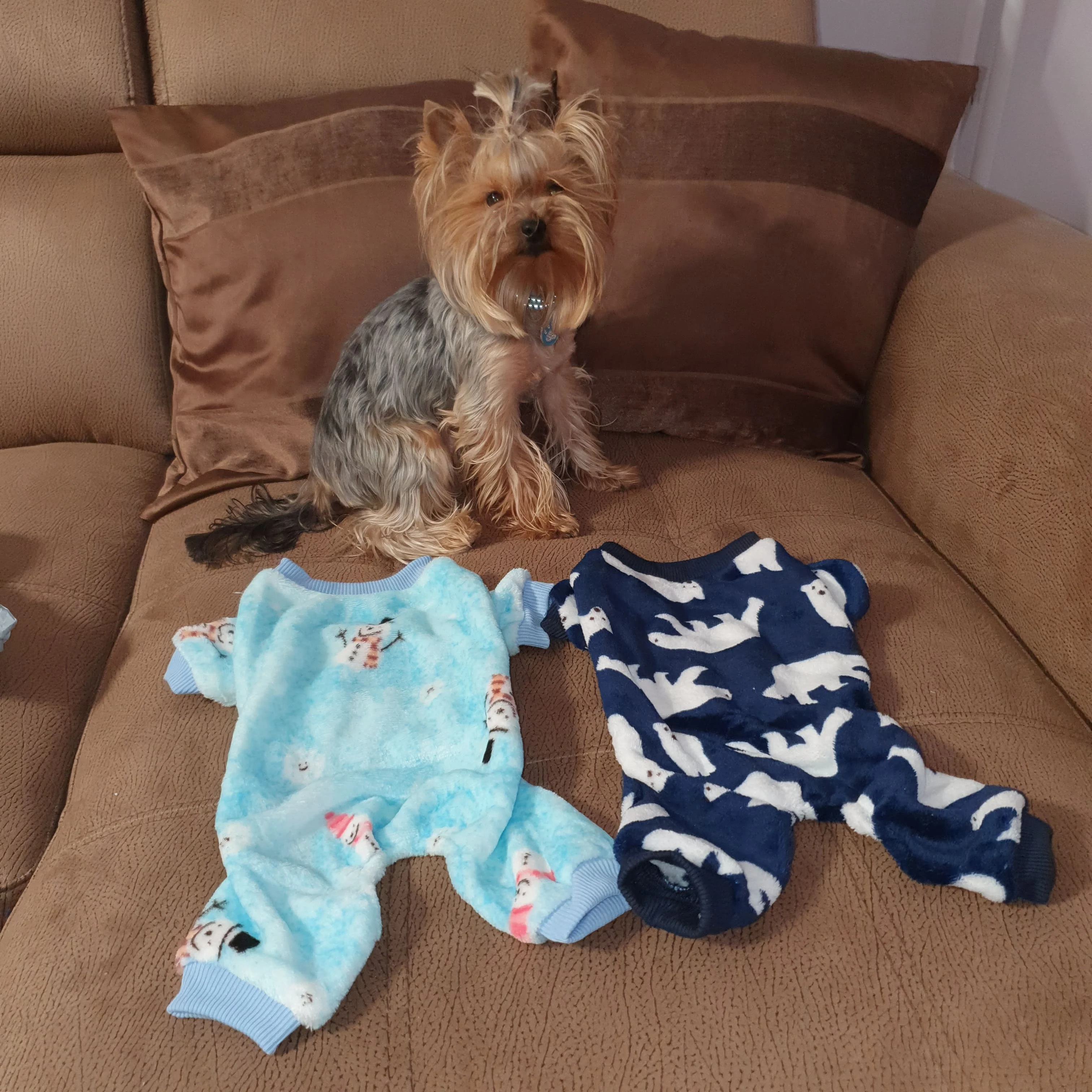 The pajamas look just like the pictures and fit perfectly. The material is super nice and pleasant. It's sewn very well, overall quality is great. It also came very quickly! The L is perfect for my 5 kg yorkie. I definitely recommend.