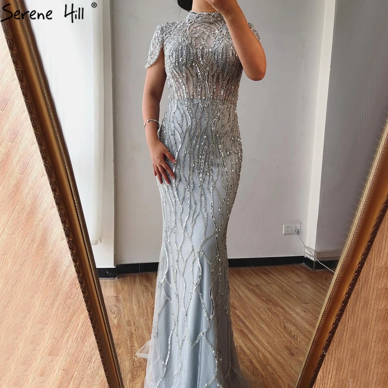 Дубай серый Русалка с короткими рукавами Вечерние платья Роскошные Бисероплетение сверкающие формальное платье 2021 Serene Hill LA70649