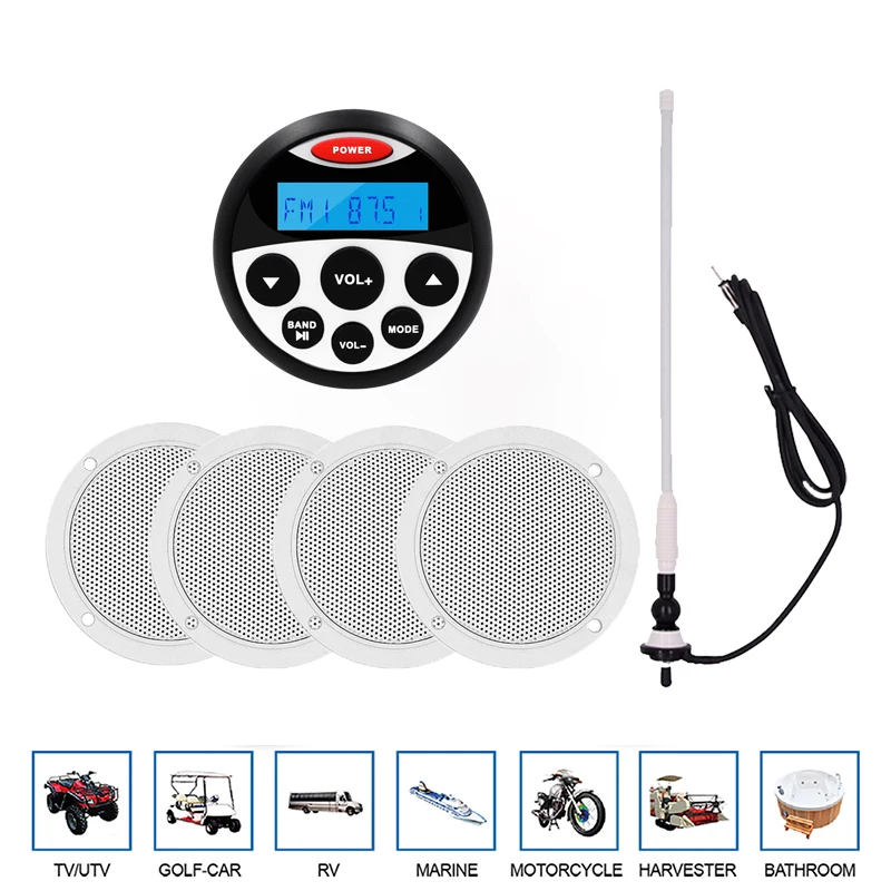 Морской Стерео Лодка аудио Bluetooth радио Автомобильный MP3-плеер для мотоцикла ATV UTV + 2 пары 4-дюймовых водонепроницаемых морских динамиков + FM AM антенна