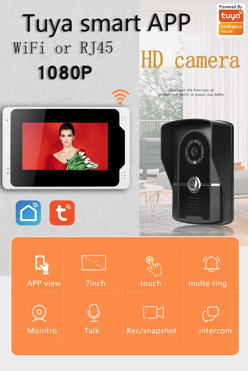 Видеодомофон Tuya, 7 дюймов, 1080P, отпечаток пальца, Wi-Fi