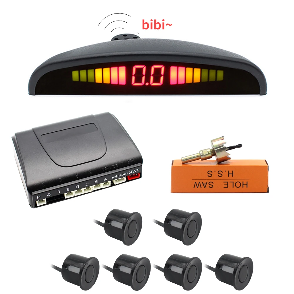Посылка включает:1 * Главный блок управления1 * светодиодный индикатор6 * парковочных датчиков (2 передних + 4 задних)1 * кольцевая пила1 * кабель питания2 * двухсторонняя наклейка