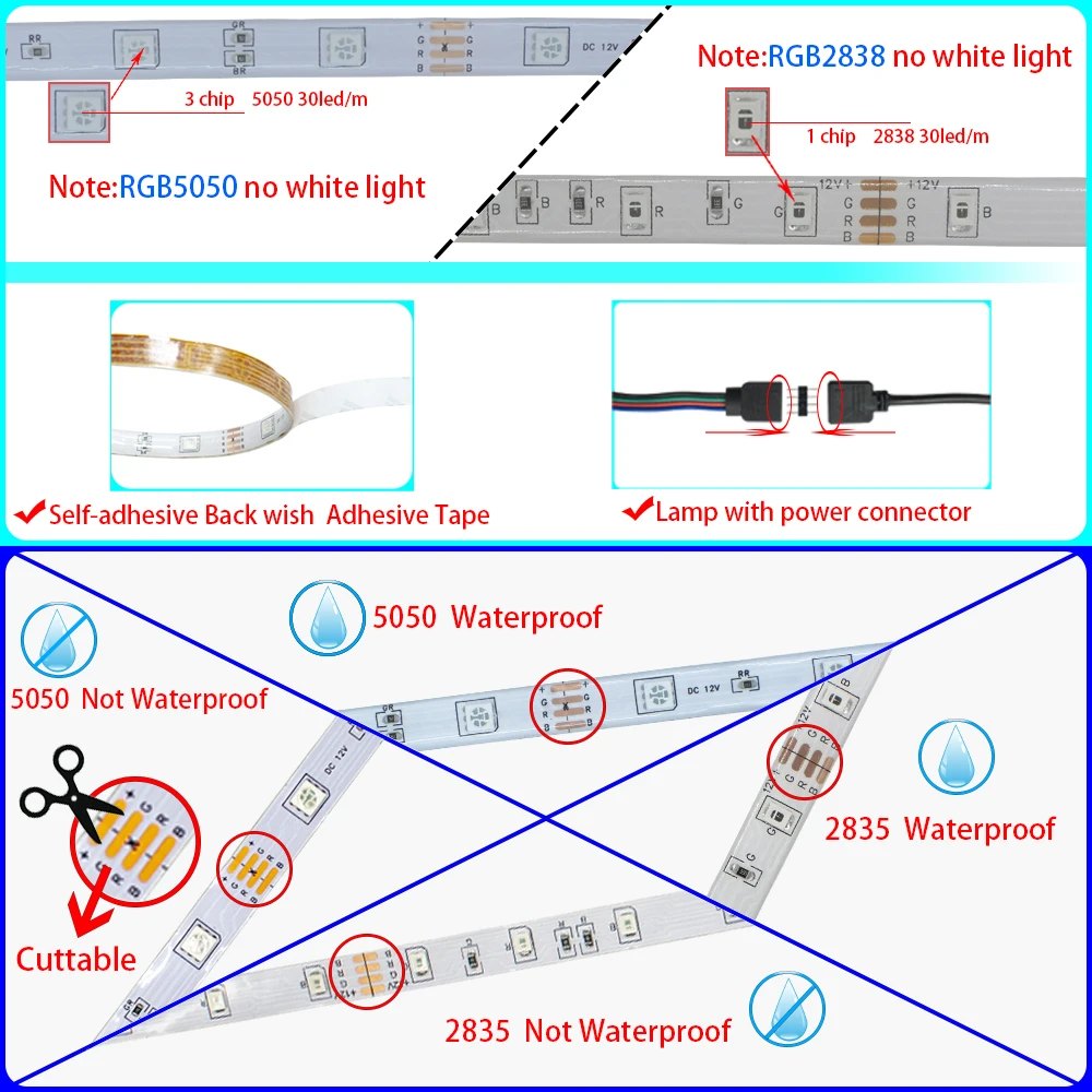 1. 5m light uses USB socket, 10M 15M 20M uses 12V DC power supply 2. Excluding battery (CR2025) Feature 1.Self-adhesive tape on reverse for easy to install and attachment. 2.Flexible strip can be curved around bends, it has durable quantity. 3.Completely Smooth and light spread ,solve the problem that light unevenly,has a splendid effect of decorations. 4.High intensity,reliability and high brightness. Production Description • Package: Anti-Static Plastic Bag • Material: FPCB • Exterior Color:2835 RGB(NO White light)/5050 RGB(WITH white light) • Input Voltage(V): DC12V • Beam Angle: 120° • Lifetime: 50,000 hours • Light Source: LED RGB 2835 SMD 300pcs/5M LED RGB 5050 SMD 150pcs/5M WIFI Controller: • Working Voltage:DC5V-28V • Output Channel: RGB channel • Output current: 4A • Connecting method: common anode • Dimension: 52mm * 22mm *9mm • Remote distance:10-20meters. • Software: Android system(at least 2.3 version with wifi function) or IOS system. • Connect way: connect with RGB led strip. • Max supported by 20m led strip 24/44key IR Features: 24 /44Keys IR Remote Controller for RGB LED SMD strip lights. Adopt IR remote to control the LED strip lights. It is able to control led strip light's color, brightness and flash modes. Support SMD 5050 RGB Strip Lights and SMD 3528 RGB Strip Lights. Including modes of Flash, strobe, Fade, Smooth. Product description: 1. 5M/roll RGB 2835 Led Strip (10M-2 rolls) 2. Bluetooth Remote Controller/Infrared remote control 3.DC 12V Power Adapter(EU/US/UK/AU)