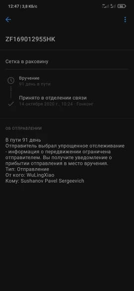 100 дней в пути и так и не пришла. Не понимаю зачем продавцы делают доставку, где нет никакой информации об отслеживании. Мошенники? Непонятно. Хорошо хоть АлиЭкспресс вернули деньги. Никогда не берите дешёвую доставку типа saver shipping, super economy и тд. Посылка летает по всему миру и вероятность того что она когда-то придёт стремится к нулю