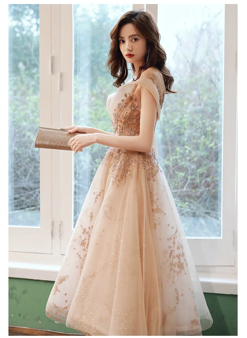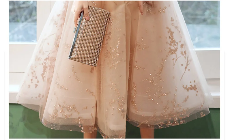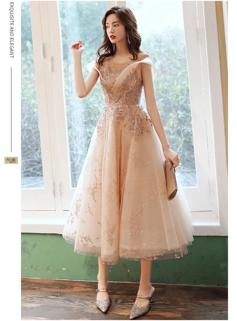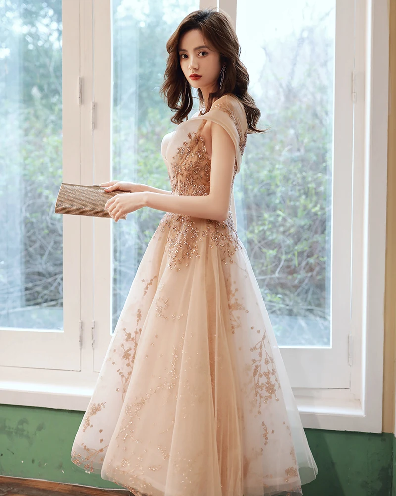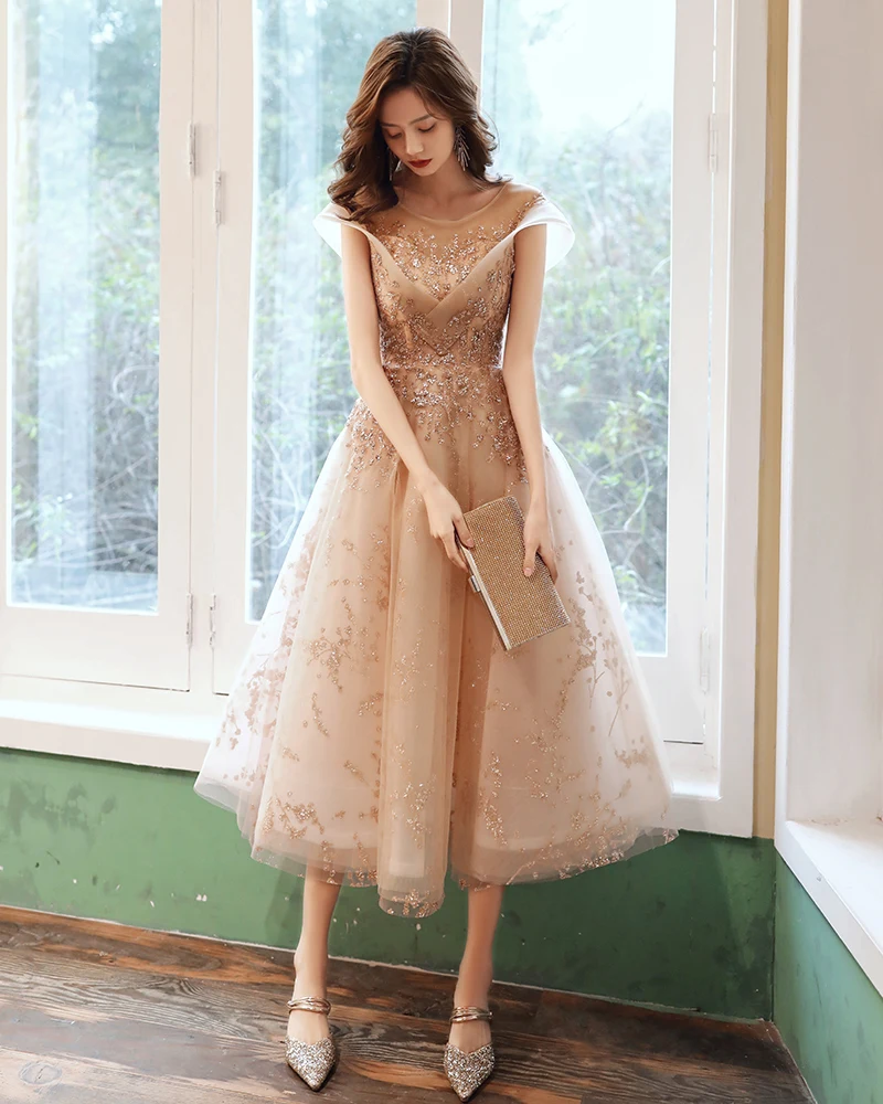 Длинные вечерние платья цвета шампанского, Роскошные платья до середины икры с аппликацией, для дня рождения, вечеринки, тюлевые платья с блестками для выпускного вечера, 2020