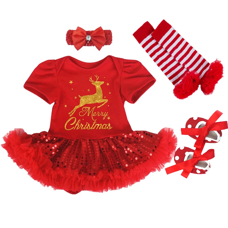 Тип:Платья для маленьких девочек платье из фатина с красными оленями и блестками для первого Рождества, платье + обувь + повязка на голову + носки, комплект из 4 предметов детская одежда, От 0 до 2 лет