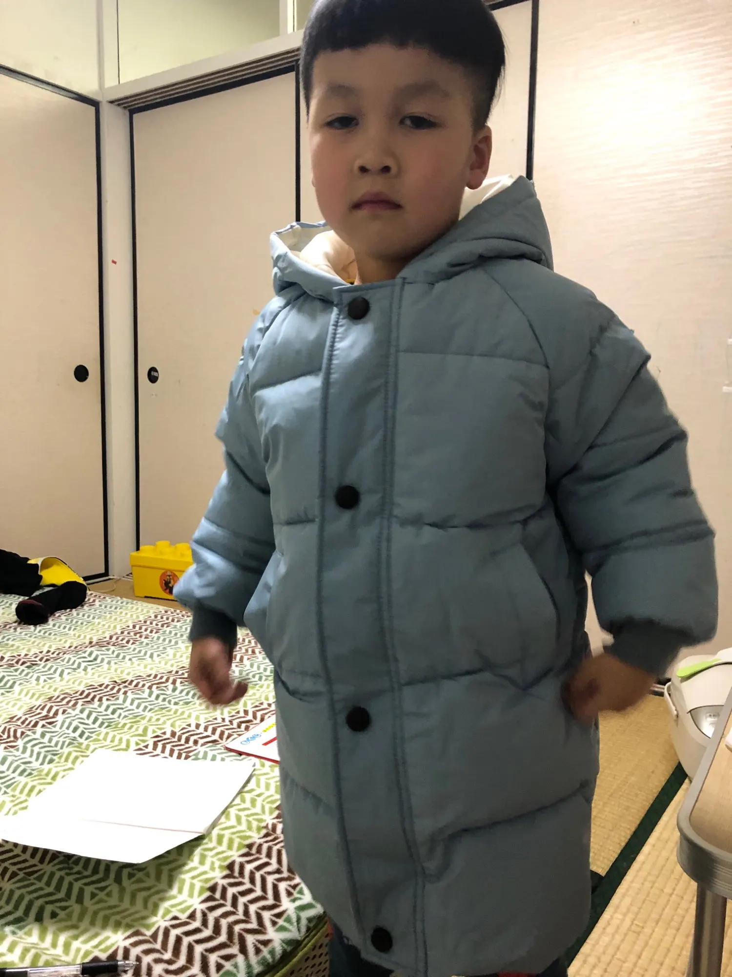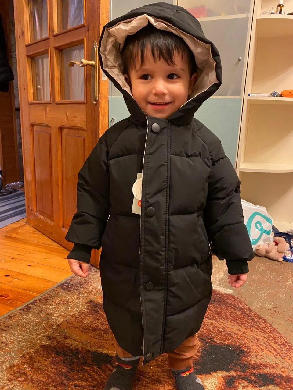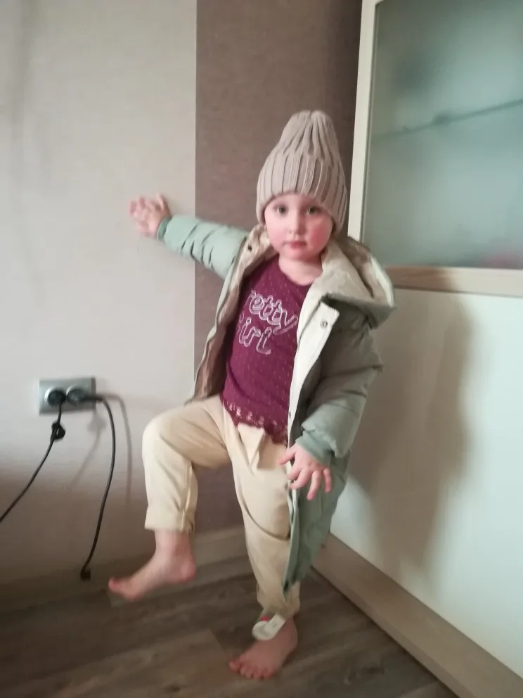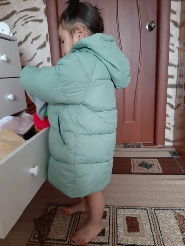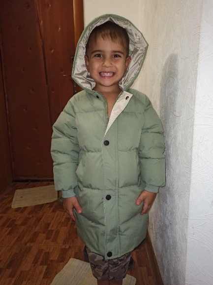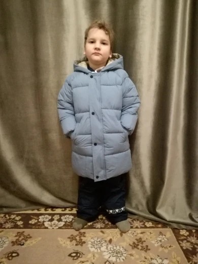 Доставка быстрая! Куртка оч хорошего качества, но это все же не пуховик , куртка с толстым наполнителем. Сшито очень аккуратно, запаха неприятного нет. Модель как мне показалось немного длиннее чем продавец показывает на фото в связи с этим буду думать какие джинсы, джогеры подобрать под это пальто. Покупала для езды в машине, удобно снять/одеть в отличии от комбезов. Рекомендую ! Я бы ещё и в других цветах купила. Рост у сына 101-102 см, одежду покупаю на 104/110, продавец порекомендовал 4Т, Длина рукава идеально подошла