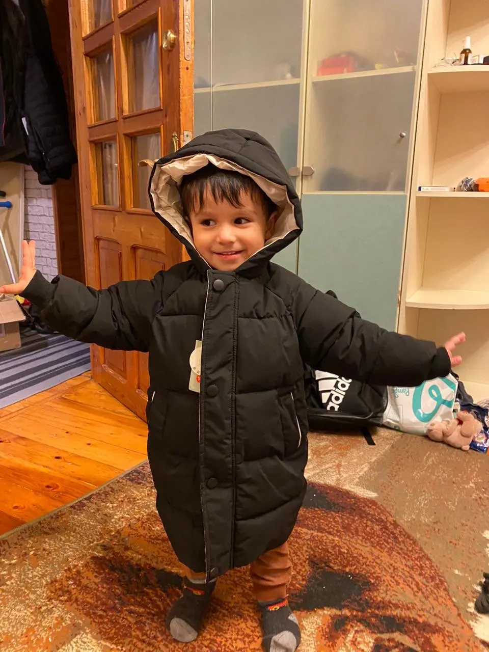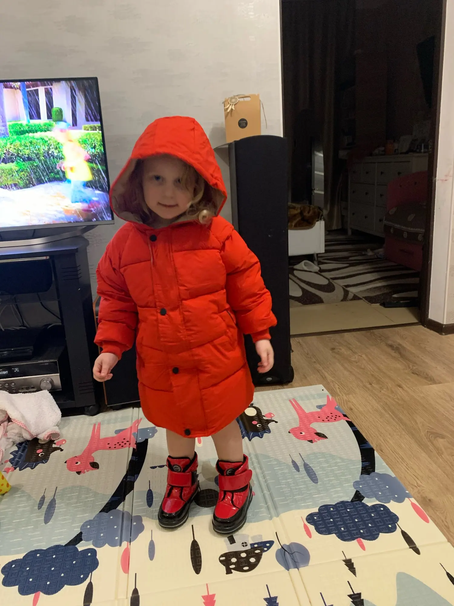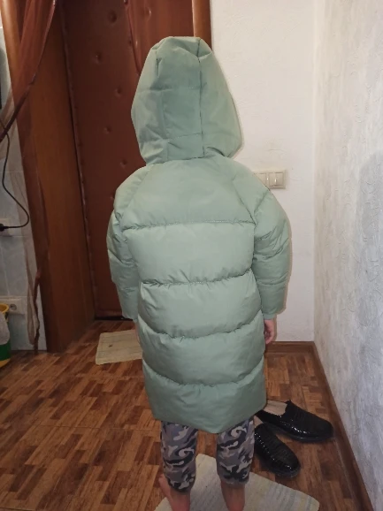 Доставка до Москвы 8 дней! На рост 100см, по совету продавца, взяла размер 5Т, чтобы сидело как пальто. Длина по спинке 60 см, внутренний шов рукава 31 см. Надевали на теплый свитер в -18 - ребенок не замерз, с тонкой кофтой в -4 - жарковато.