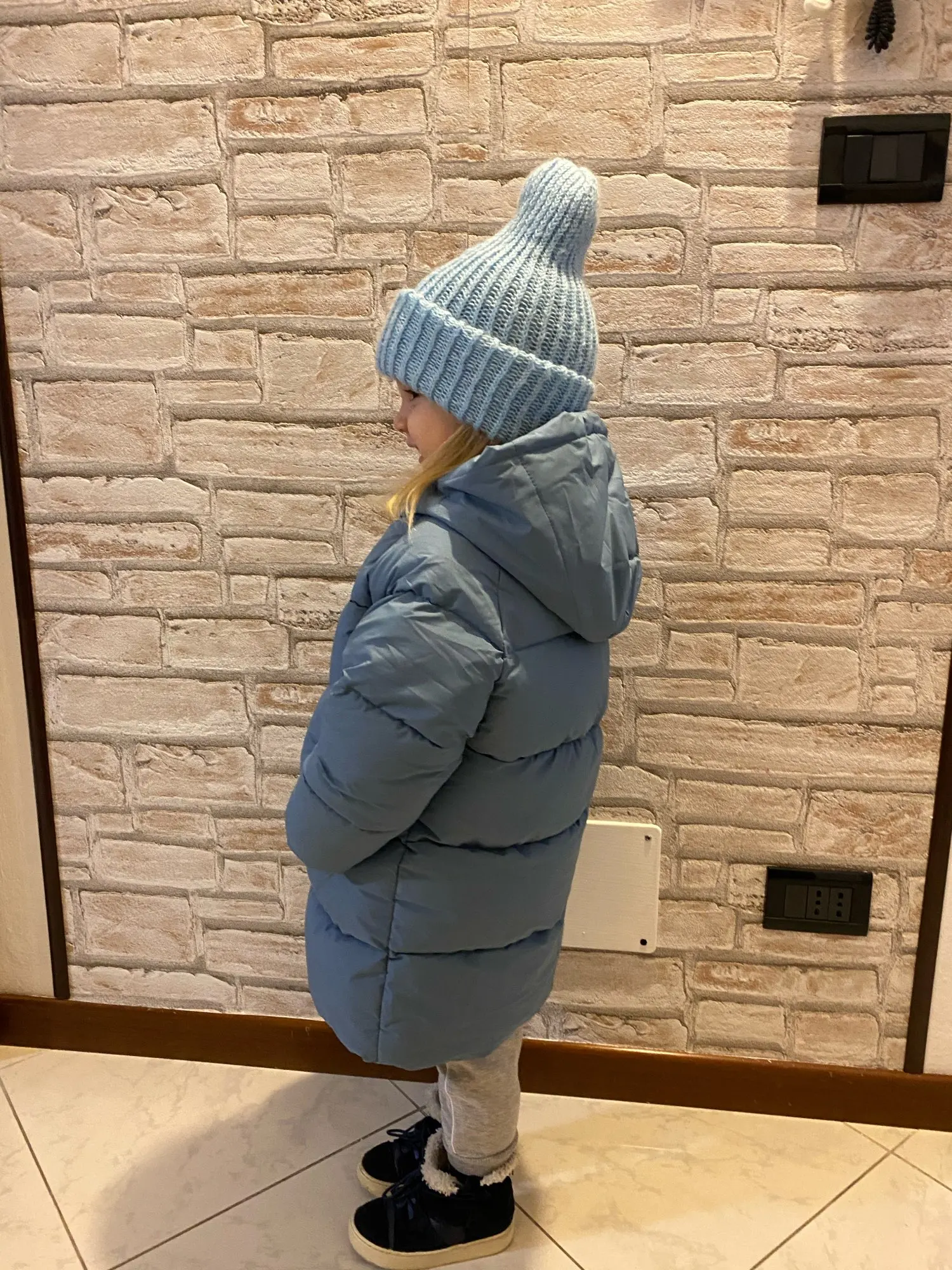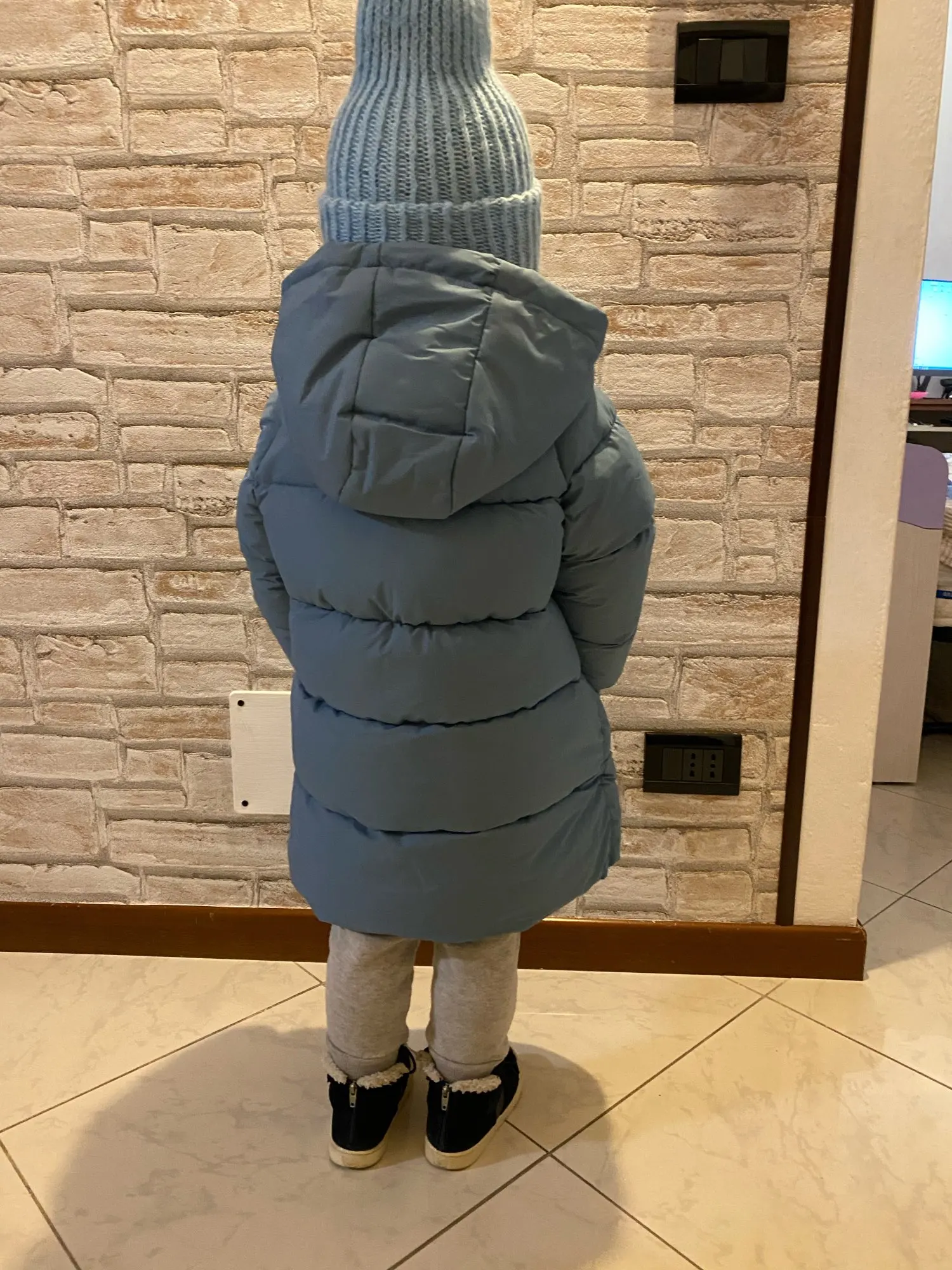 Очень красивое пальто))легкое как пушинка но при этом тёплое и комфортное,не сковывает движений ребёнка.заказала размер 110 ,на фото девочка 96 см ростом.нам пока с запасом)как раз как и хотелось.доставка в Италию чуть больше двух недель.