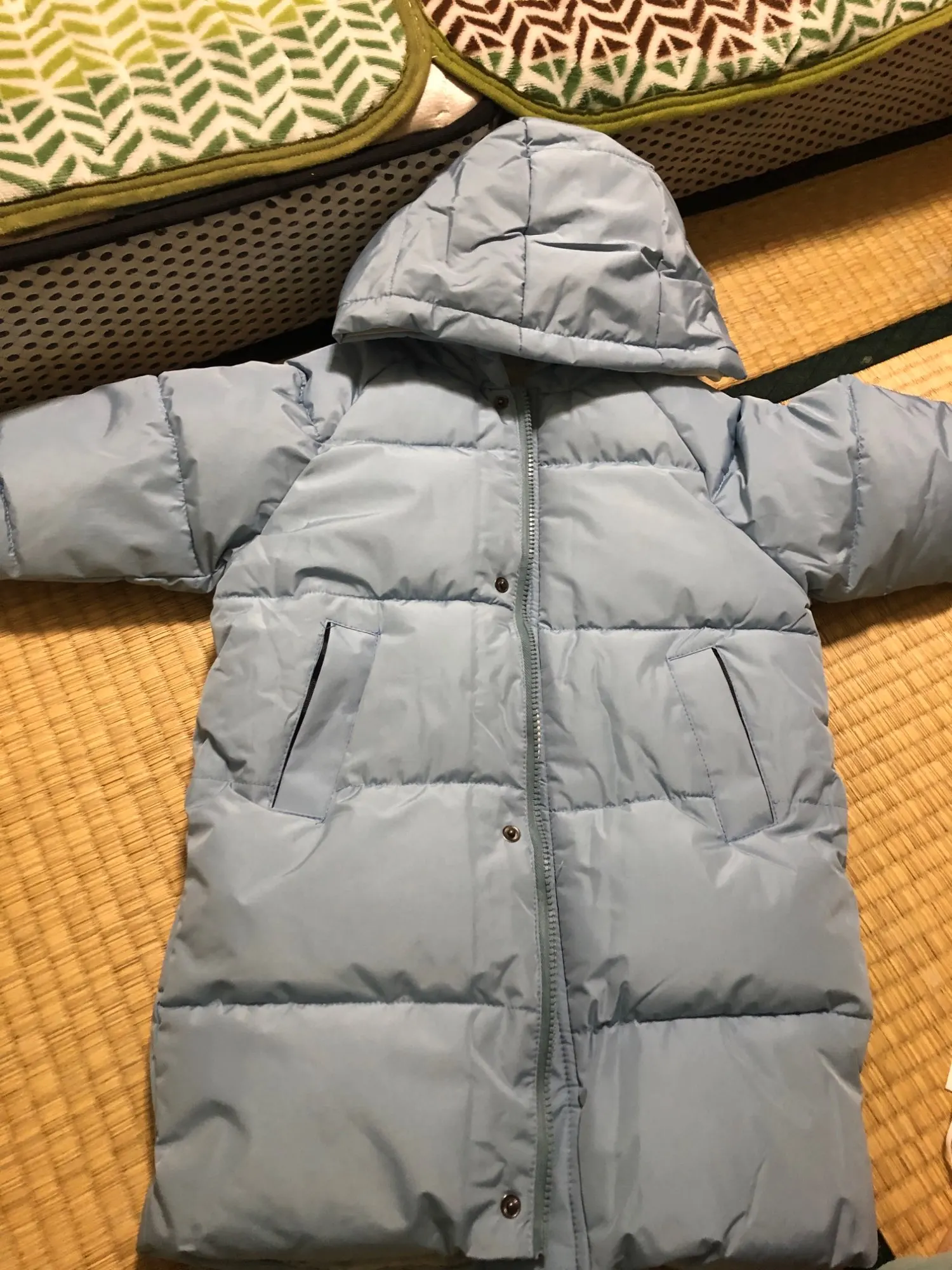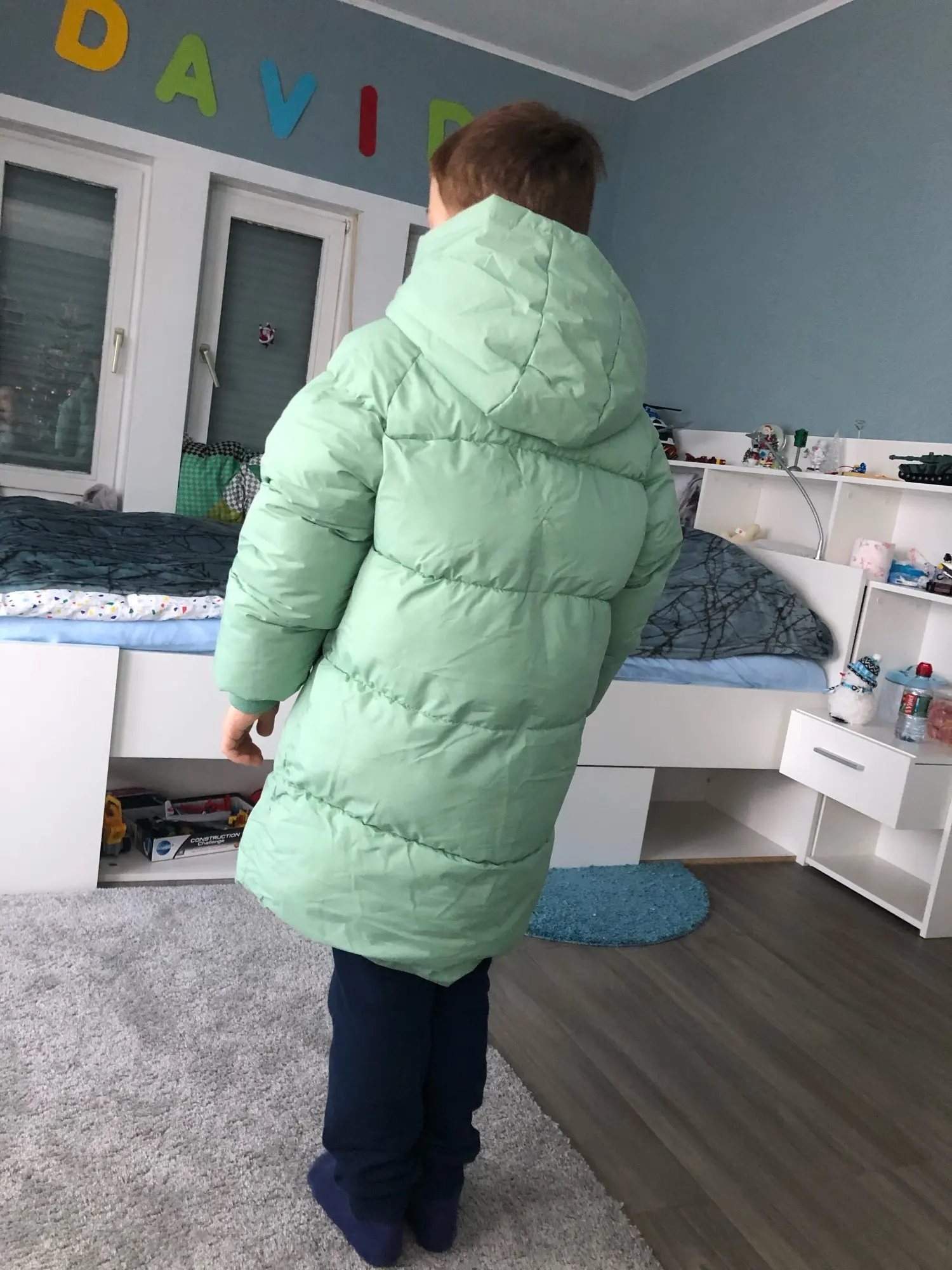 Очень хороший пуховик, цвет очень красивый. На 114см немного с запасом. К товару претензий нет, только жаль что петельки никто не делает на верхней одежде. Продавец очень долго отправлял заказ, из-за этого он не пришёл к новому году, хотя доставка стояла на конец декабря.