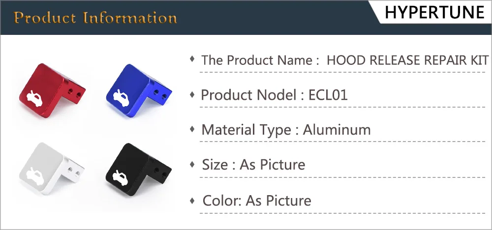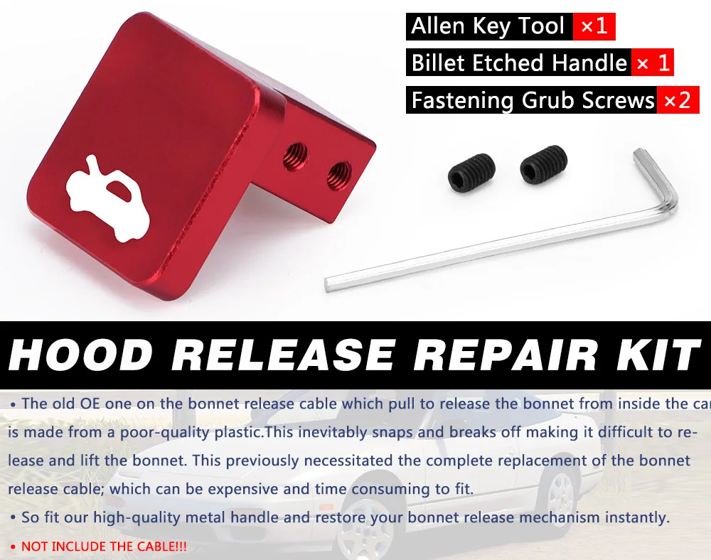 This replacement hood release latch is a repair for the OEM plastic latch which will often crack and break off the end of the cable.This replacement latch can be installed in a few minutes. It requires the removal of the corner plastic kick plate. Then about 1" of the remaining plastic must be trimmed off the end of the cable with wire cutters. Slip it over the end of the cable, tighten the 2 set screws, replace the corner plastic kick plate, and you are finished.