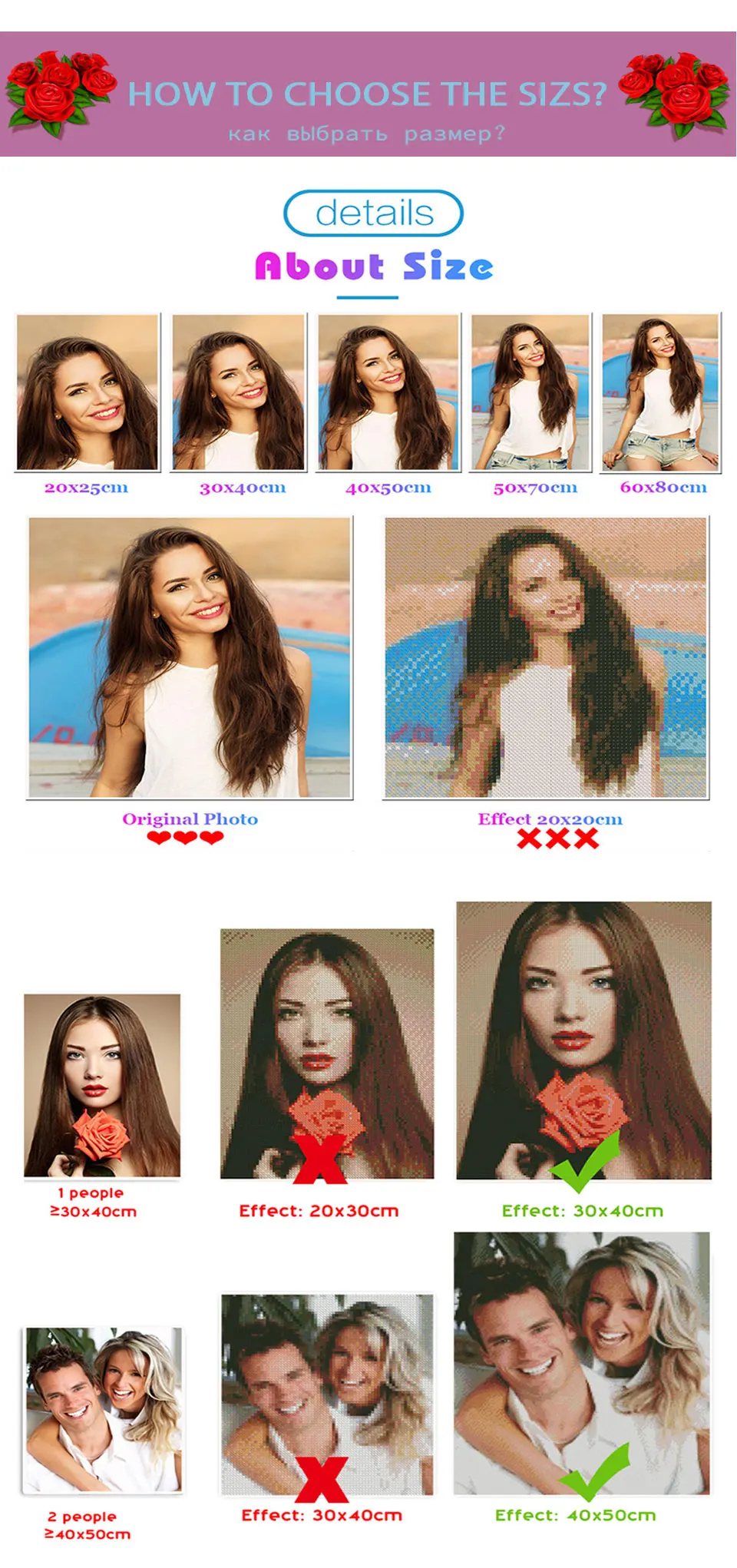 Если вам нужно больше фона, лицо будет размыто, мы будем рекомендовать Вам наиболее подходящий размер.Если вы хотите, чтобы лицо было больше деталей, если вам нужно прозрачное лицо, мы должны вырезать это изображение до нужного размера.Наш размер относится к размеру холста, а не к размеру рисунка.
