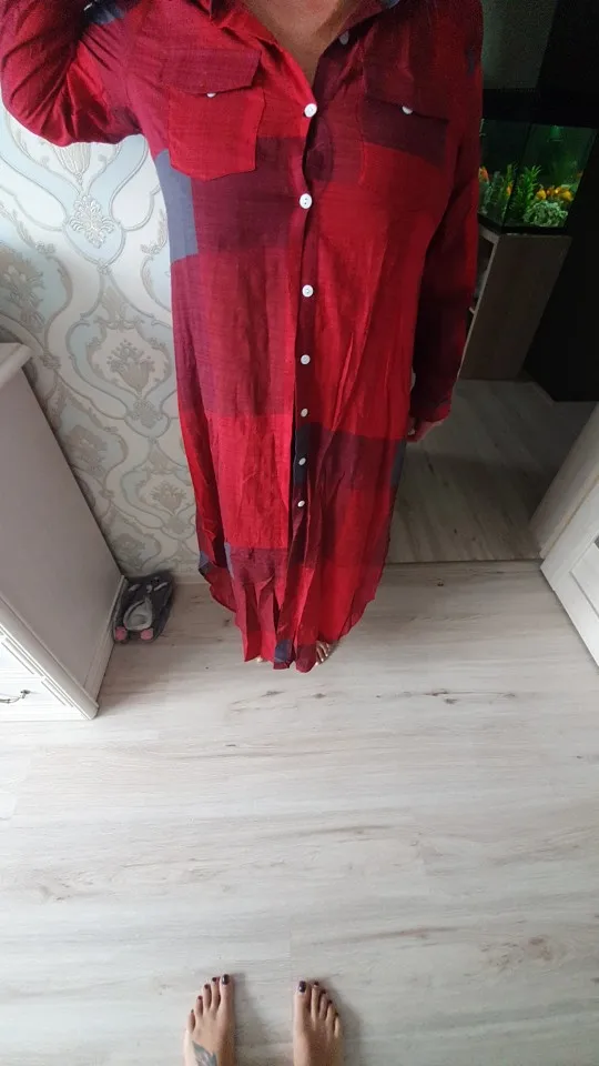 На фото цвет яркий и сочный, а в жизни темнее, ткань полусинтетика, но тонкая. Для лета подойдёт. И размеры не совпадают, велико.
