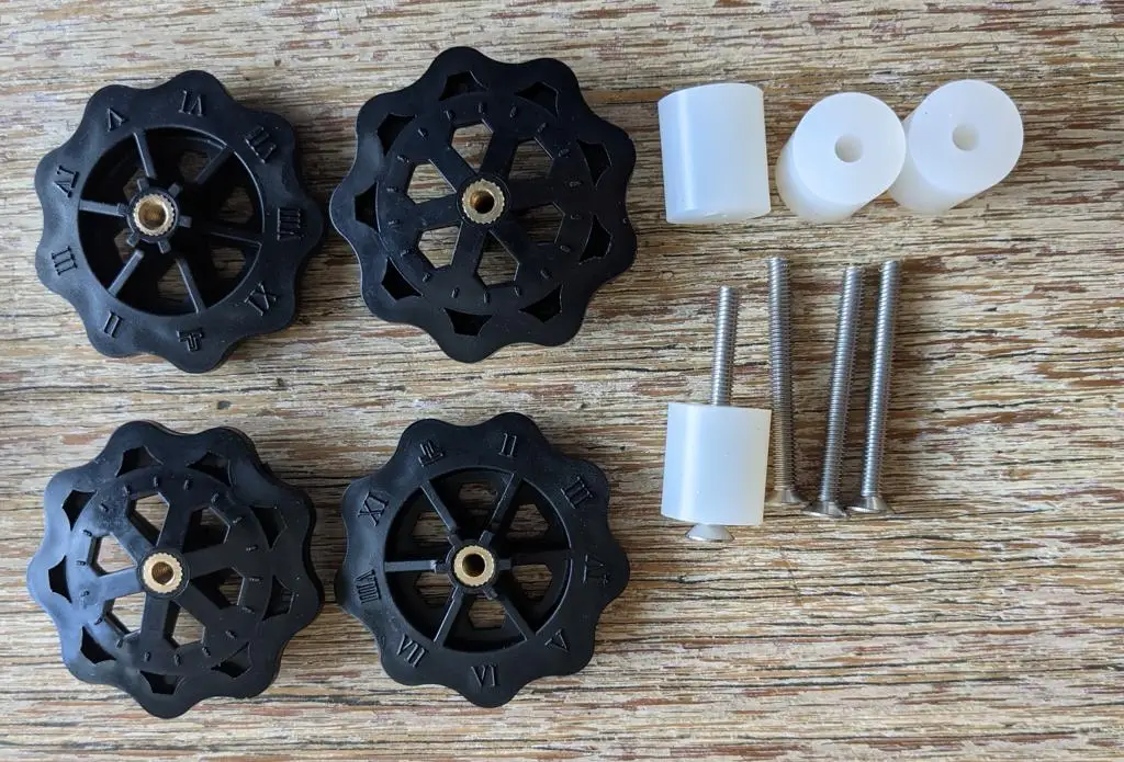 Владельцы Anet A8 в курсе! Черные гайки не подходят под кровать и ограничивают его движение и винты также слишком толстые, поэтому вам нужно просверлить большие отверстия. В этом комплекте только резиновые колонны.