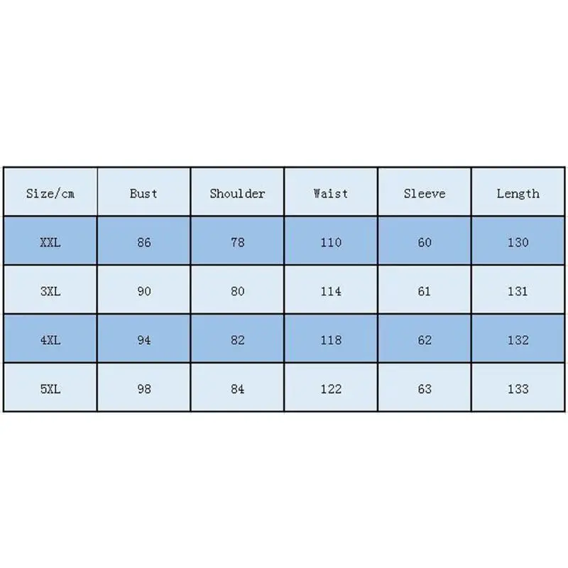 Размер: 2XL/3XL/4XL/5XL Размер/см Бюст Плечо Талия Длина рукава 2XL 86 78 110 60 130 3XL 90 80 114 61 131 4XL 94 82 118 62 132 5XL 98 84 122 63 133