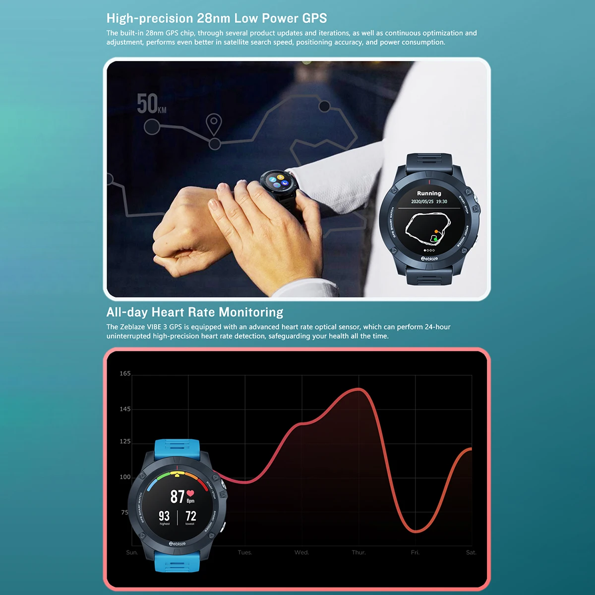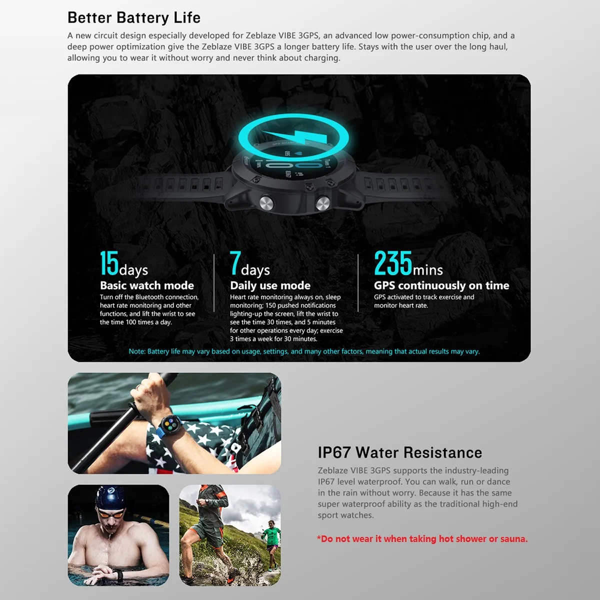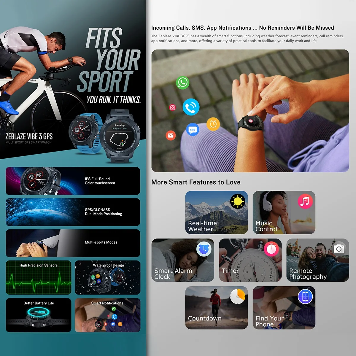 Особенности: [GPS/ГЛОНАСС]Встроенный GPS чип 28 нм обеспечивает еще лучшую скорость спутникового поиска, точность позиционирования и энергопотребление. [Монитор сердечного ритма]Оснащенный передовым оптическим датчиком сердечного ритма, Zeblaze VIBE 3 GPS может контролировать частоту сердечных сокращений в течение 24 часов. [Несколько режимов тренировки]Есть несколько профессиональных датчиков, которые записывают физические данные в полном объеме, и обеспечивают научный анализ для увеличения объема ваших упражнений. [Монитор сна]Обеспечивает отслеживание светильник и глубокого сна, а также пульса во время сна, чтобы помочь построить лучшие привычки перед сном. [Длительный срок службы батареи]С помощью схемы, усовершенствованного чипа и алгоритма оптимизации мощности, часы остаются в течение длительного срока службы батареи и позволяют избавиться от низкого заряда батареи. [Водонепроницаемость IP67]Вы можете ходить, бегать или dance in the rain без беспокойства. Потому что он обладает такой же водонепроницаемостью, как и традиционные высококачественные спортивные часы. [Уведомление]Поддерживает большинство социальных приложений на рынке и push-уведомления о звонках, sms, приложениях, погоде, событиях и многого другого. [Больше функций]Управление музыкой, смарт-будильник, секундомер, обратный отсчет, встряхивание и съемка (дистанционный затвор), Поиск телефона и т. д. Примечание:* Загрузите и установите приложение Fundo с помощью qr-кода в руководстве пользователя, чтобы насладиться полными функциями часов.* Не носите его во время принятия горячего душа или сауны. Параметры:Размер экрана: 1,3 дюймовТип экрана: цветной сенсорный экран IPSРазрешение: 240*240 пикселейBT: BT4.0Совместимость: совместимость с Android 4,4 или более поздней версии, iOS 9,0 или более поздней версии.GPS: GPS/ГЛОНАССДатчик: Датчик частоты сердечных сокращений, датчик приближения, акселерометрТип батареи: литий-полимерныйЕмкость аккумулятора: 280 мАчПриложение: FundoЯзык приложения: английский, португальский (Бразилия), португальский (Португалия), русский, испанский, итальянский, французский, немецкий, 한어, LanguageФункции: GPS/GLONASS, монитор сердечного ритма/сна, многофункциональные циферблаты, шагомер, потребление калорий, несколько тренировок, цель ежедневных шагов, темп и расстояние в реальном времени, напоминание о малоподвижности, погода, напоминание об уведомлениях, секундомер, обратный отсчет, поиск моего телефона, будильник, обнаружение запястья, встряхивание и съемка (дистанционный затвор), управление музыкой. Характеристики:Бренд: ZeblazeМодель: VIBE 3GPSМатериал: АБС + ТПУЦвет: черный/синий(Опционально)Уровень водонепроницаемости: IP67 (5 атм)Время зарядки: около 3 часовПодходит для размера запястья: 135-230 ммШирина ремешка: 24 мм/0,94 дюймаЧехол Диаметр: 50,5 мм/1.98inЧехол Толщина: 15,9 мм/0.62inВес изделия: 56 г/1,97 унцийПосылка Размеры: 15,8*10,5*3 см/6,22*4,13 * 1.18inВес посылка: 200 г/7,05 унций Упаковочный лист:1 * часы1 * зарядный кабель1 * Руководство пользователя (многоязычное)